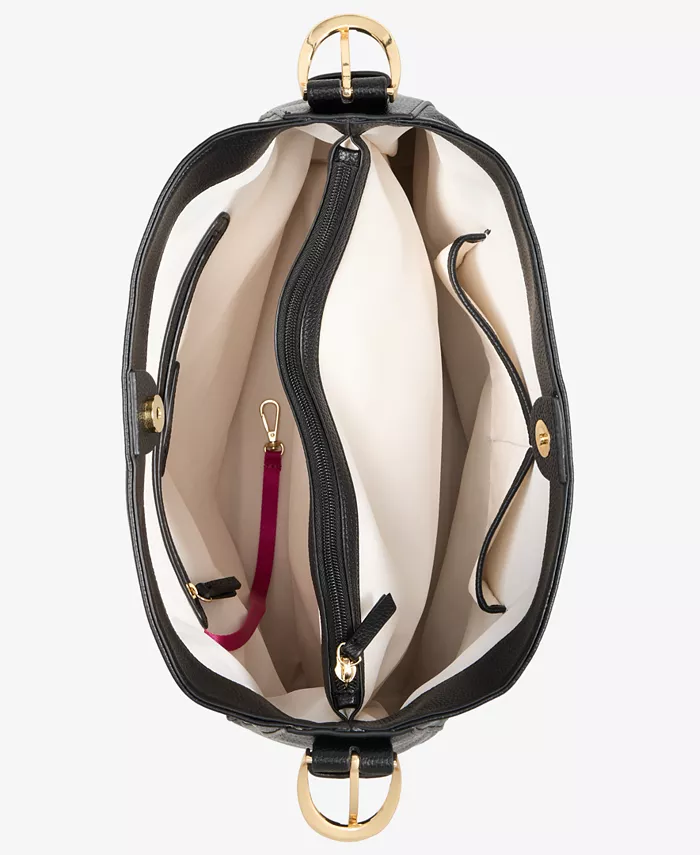 Золотистая внешняя фурнитура и карман на молнии сзади; внутренние накладные карманы, карман на молнии сзади и внутренний разделитель на молнии