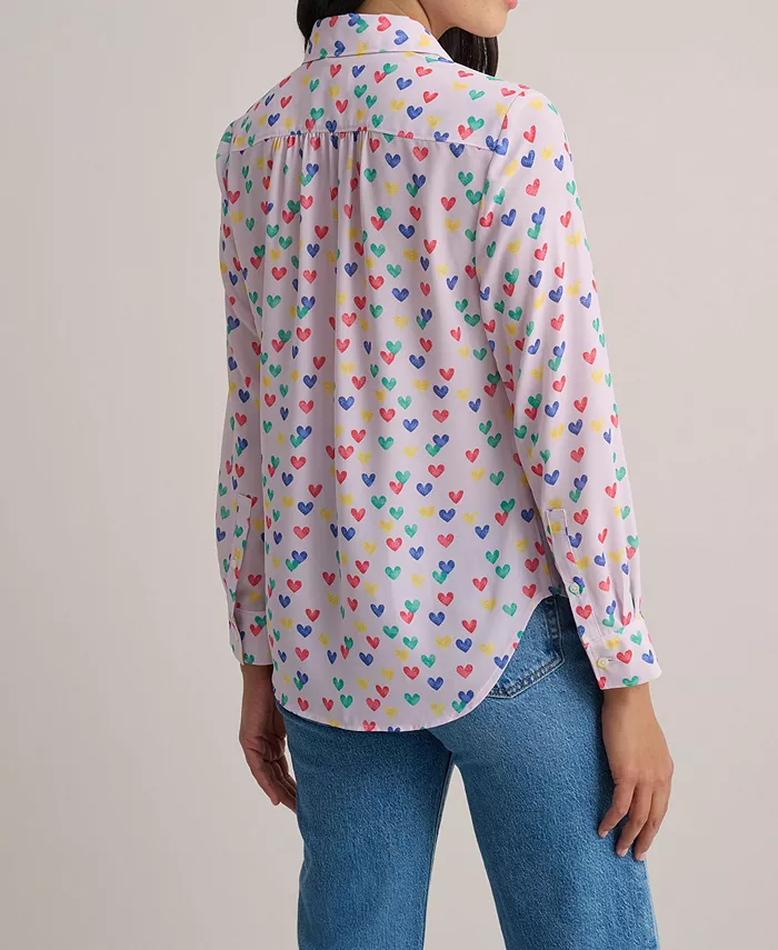 Вашему гардеробу просто необходима эта уникальная рубашка с принтом в виде сердец. Она отличается причудливым, привлекающим внимание узором на нежно-лавандовой основе, который будет прекрасно сочетаться с любой одеждой в вашем гардеробе. Легкая креповая ткань приятна на ощупь и обеспечивает непринужденный и элегантный силуэт.