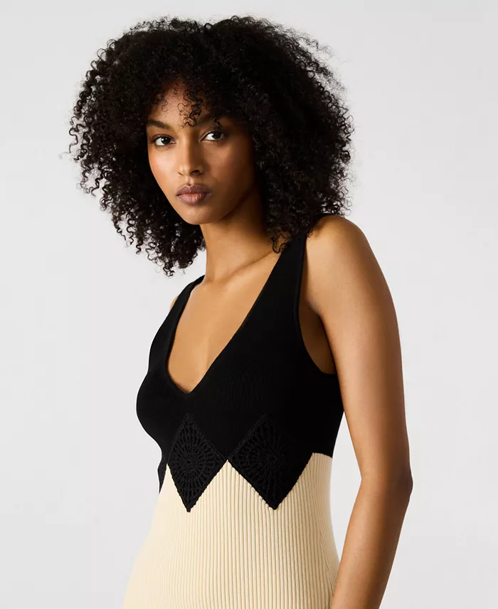 Это платье миди Steve Madden, сочетающее в себе стиль цветовых блоков, смелый подход и тональную вышивку, представляет собой современный образ с комбинацией ширины ребристой вязки.
