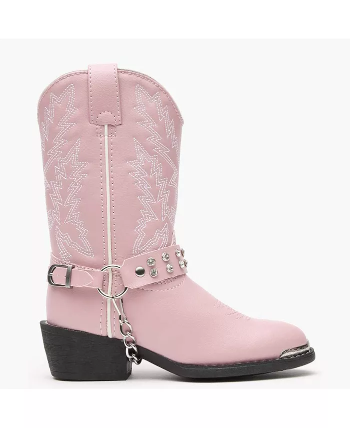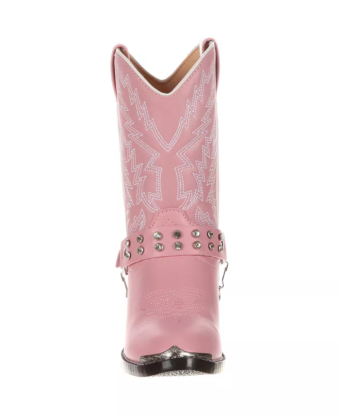 Если ваша дочь – воплощение девчонки, вы просто обязаны подарить ей пару ковбойских сапог Durango Little Kid Western. Розовый верх невероятно милый и изготовлен из искусственной кожи, идеально подходящей для детских ботинок благодаря высокой прочности и лёгкости в уходе. Декоративная строчка, белая окантовка вдоль голенища и воротника, металлический носок и съёмный ремешок со стразами – всё это придаёт этим ботинкам особый, блестящий вид. Такие полезные особенности, как утопленная линия верха и прочные язычки, позволяют ребёнку легко надевать и снимать эти ботинки без посторонней помощи. Мягкая стелька и подушечка на пятке обеспечивают комфорт и поддержку растущих ног в течение всего дня. Эти ботинки имеют классический круглый носок R, предлагающий вневременную форму в стиле вестерн. Стальной супинатор обеспечивает надёжную поддержку свода стопы и повышает общую устойчивость. Чёрная подошва из ПВХ обеспечивает долговечность и прекрасно дополняет розовый верх.