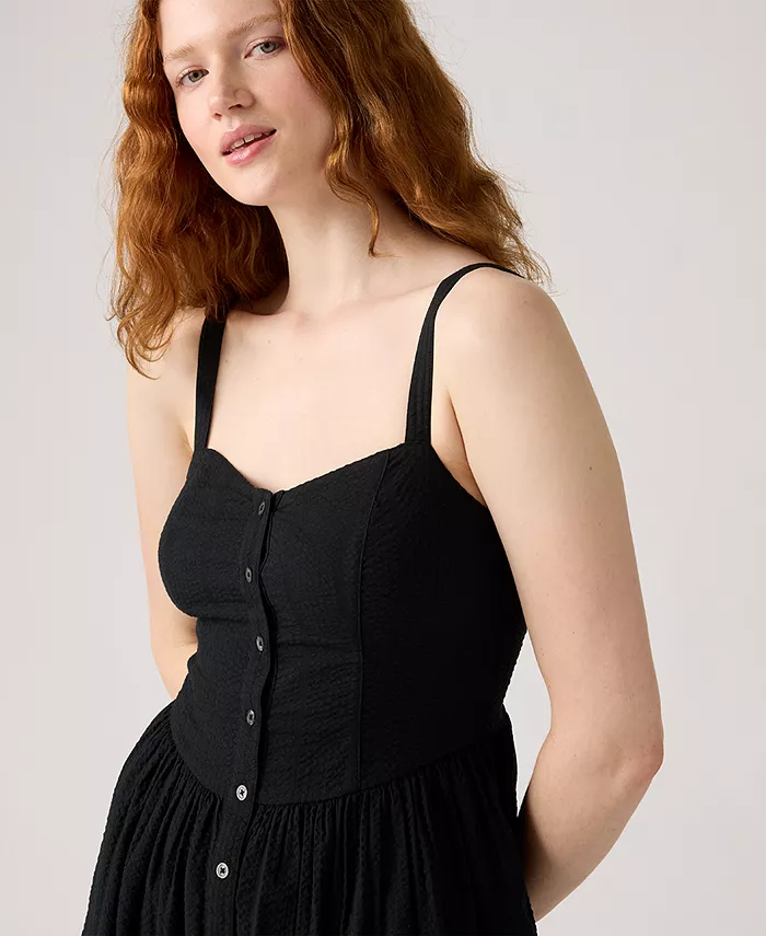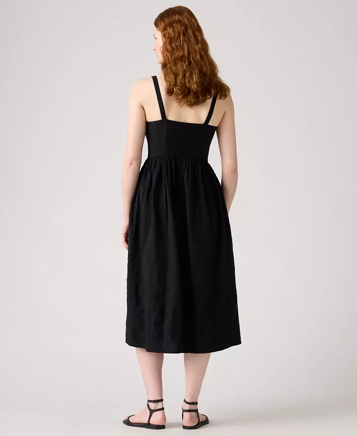 Levi's обновляет платье миди с помощью прохладной хлопковой ткани и модного лифа-бюстье для создания веселого и привлекательного образа.