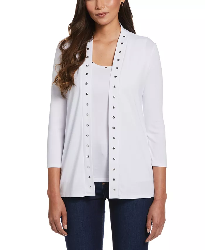 Ряд серебристых заклёпок по переду и сзади на горловине придаёт этому кардигану от Rafaella эффектный вид. Удобный и универсальный, этот открытый кардиган легко перенесётся как в офис, так и на девичник.