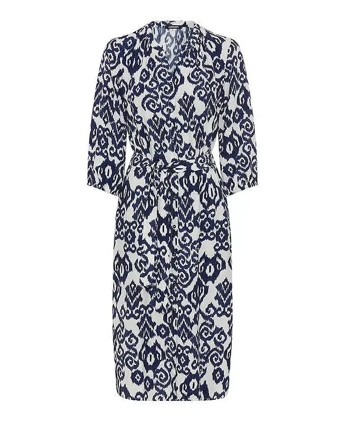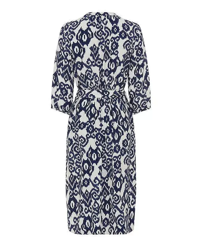 Изделие украшено принтом икат по всей поверхности, застегивается на пуговицы спереди и имеет соответствующий завязку на талии, подчеркивающую форму.