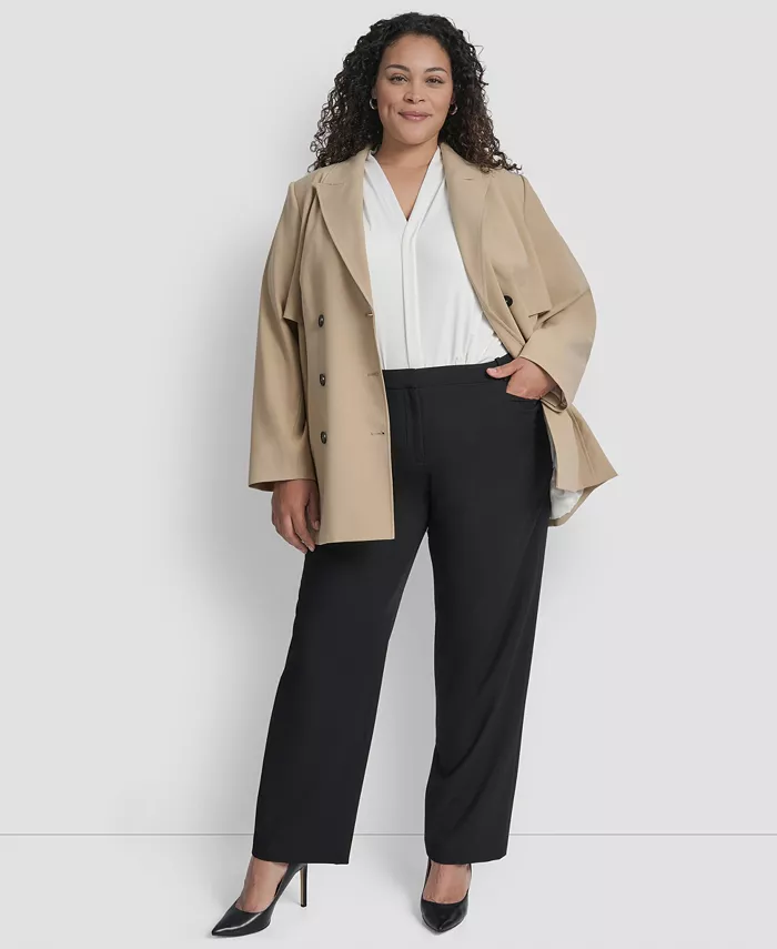 Создайте изысканный образ с этим двубортным тренчем DKNY plus-size с воротником-стойкой и длинными рукавами. Подплечники добавляют структуру и элегантный вид.