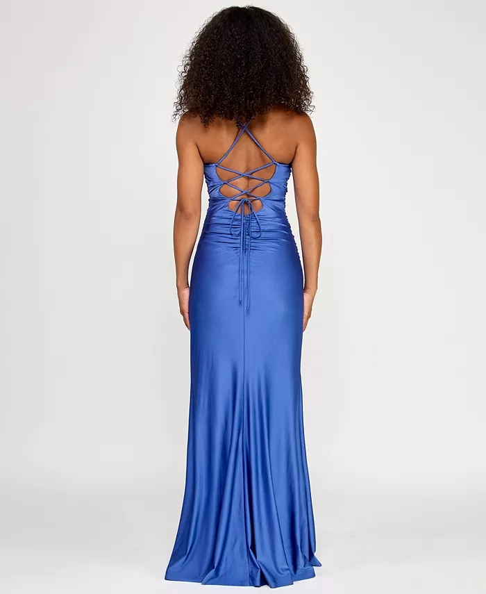 Это длинное облегающее платье от City Studios, шикарное и подчеркивающее фигуру, с V-образным вырезом на сборке и лифом с рюшами. Перекрёстная шнуровка на спине добавляет современный шарм. Высокий разрез спереди до бедра добавляет движения и необходимую долю драматизма.