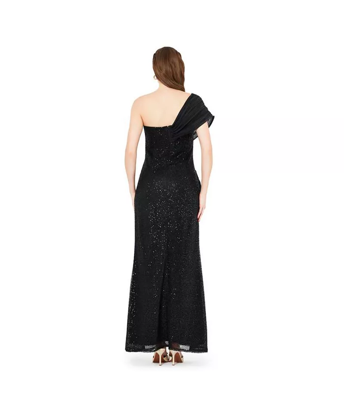 Ослепительное и в то же время изысканное, это черное платье на одно плечо выполнено из мерцающей ткани с пайетками и дополнено фигурным накладным элементом на лифе. Мягкая драпировка добавляет выразительности и текстурности, а облегающий силуэт длиной до пола удлиняет фигуру, создавая сдержанный гламур. Идеально подходит для строгих вечеров, официальных гала-ужинов или вечерних торжеств, где элегантность сочетается с блеском.