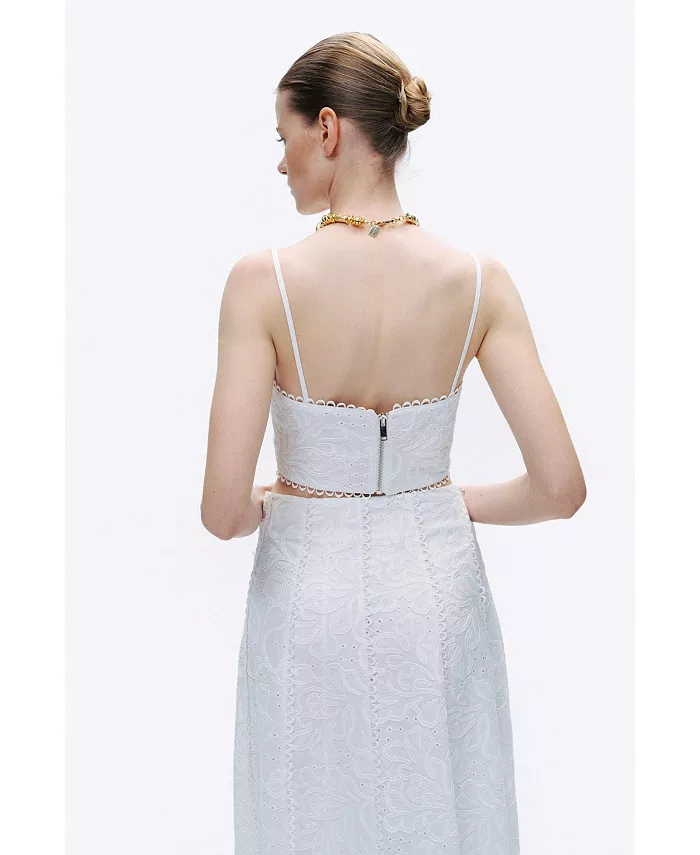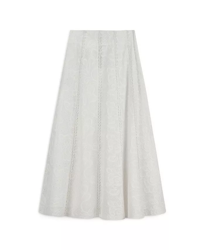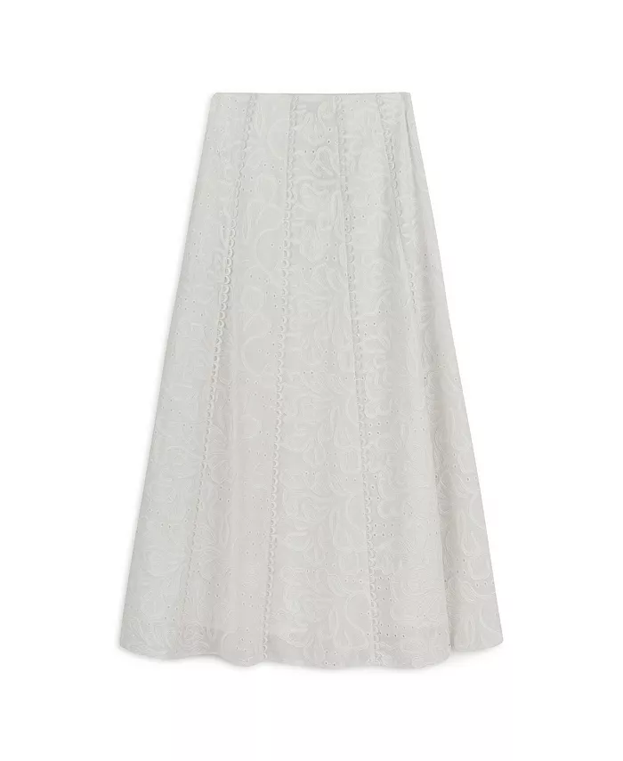 Юбка со стандартной линией талии, выполненная без карманов для создания обтекаемого вида, украшена изящной вышивкой, которая придает изделию текстуру и изысканность.