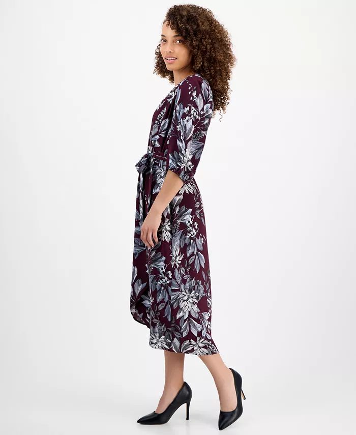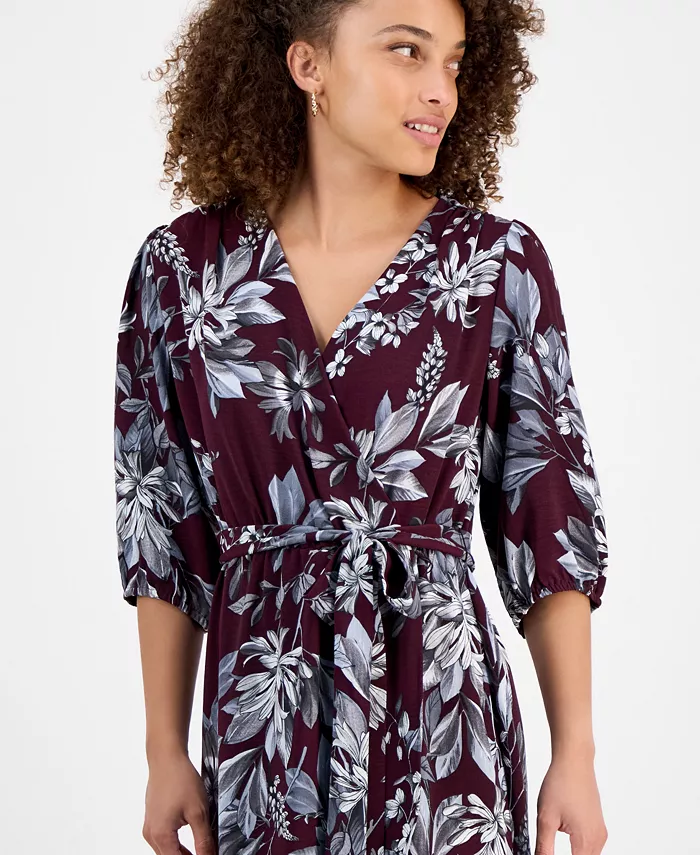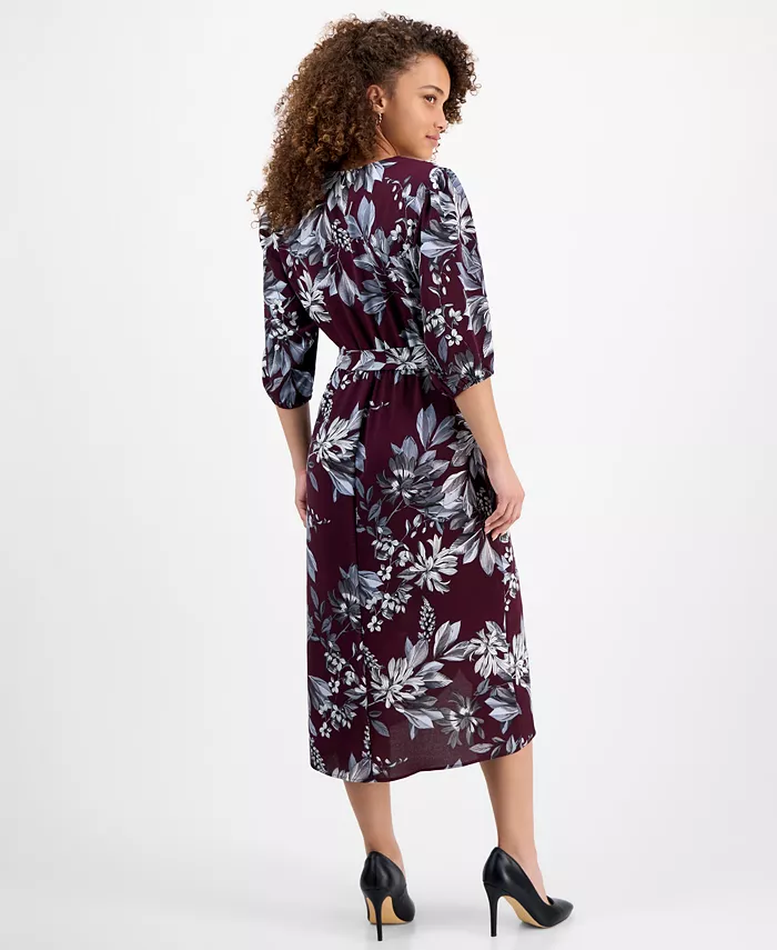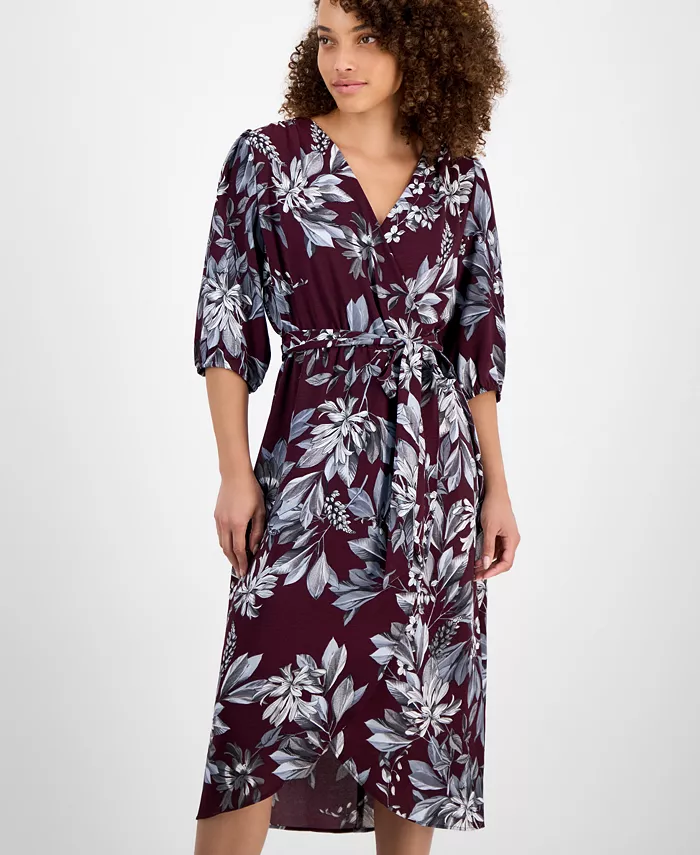 Произведите впечатление, куда бы вы ни пошли, в этом миниатюрном платье-халате с принтом от Connected, с рукавами-блузоном длиной 3/4 и длиной ниже колена.