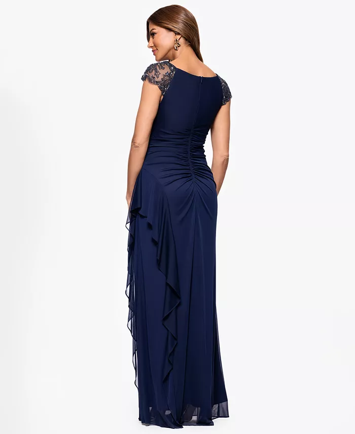 Подчеркните свой образ, надев это женское платье для миниатюрных с короткими рукавами от XSCAPE. Вырез горловины «лодочка» придаёт ему классический шарм, а отделка бисером на кокетке делает его ещё привлекательнее.
