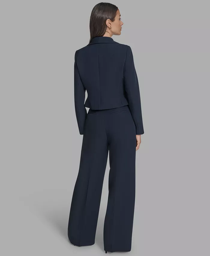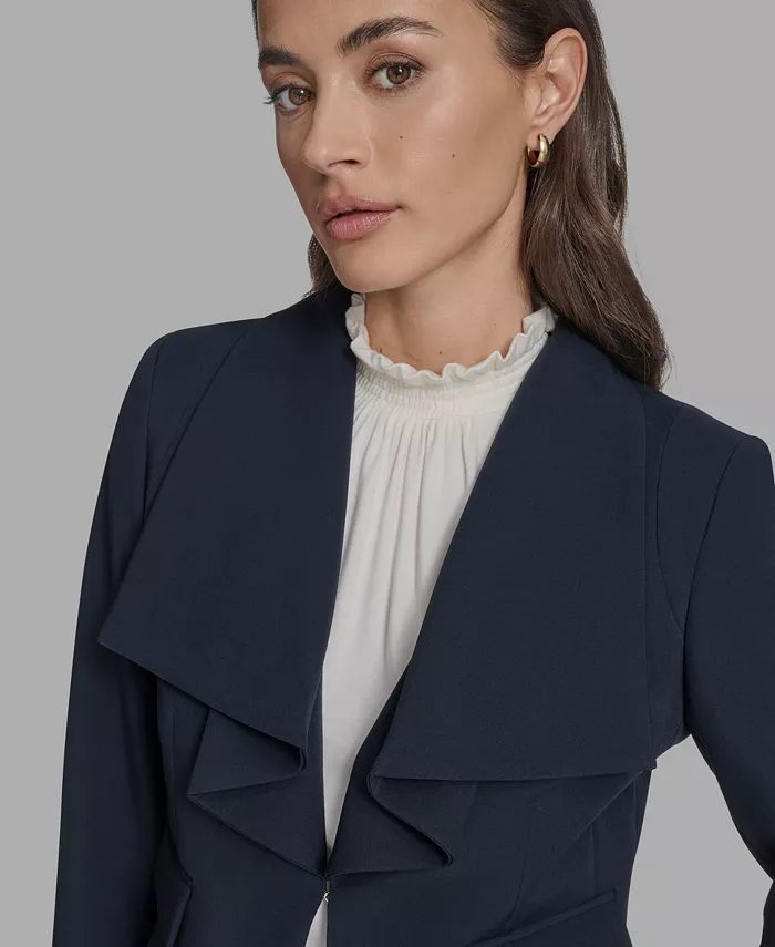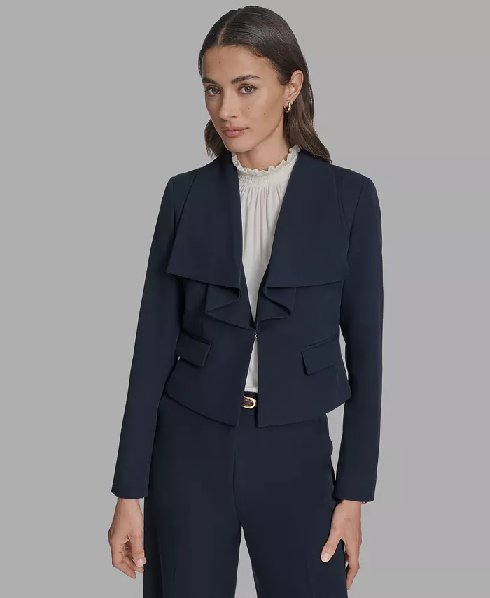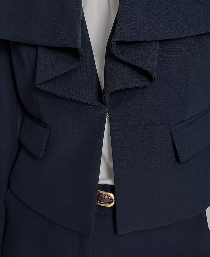 Элегантный укороченный блейзер BCBG отличается уникальными каскадными лацканами с воланами, что делает его стильным вариантом базовой вещи.