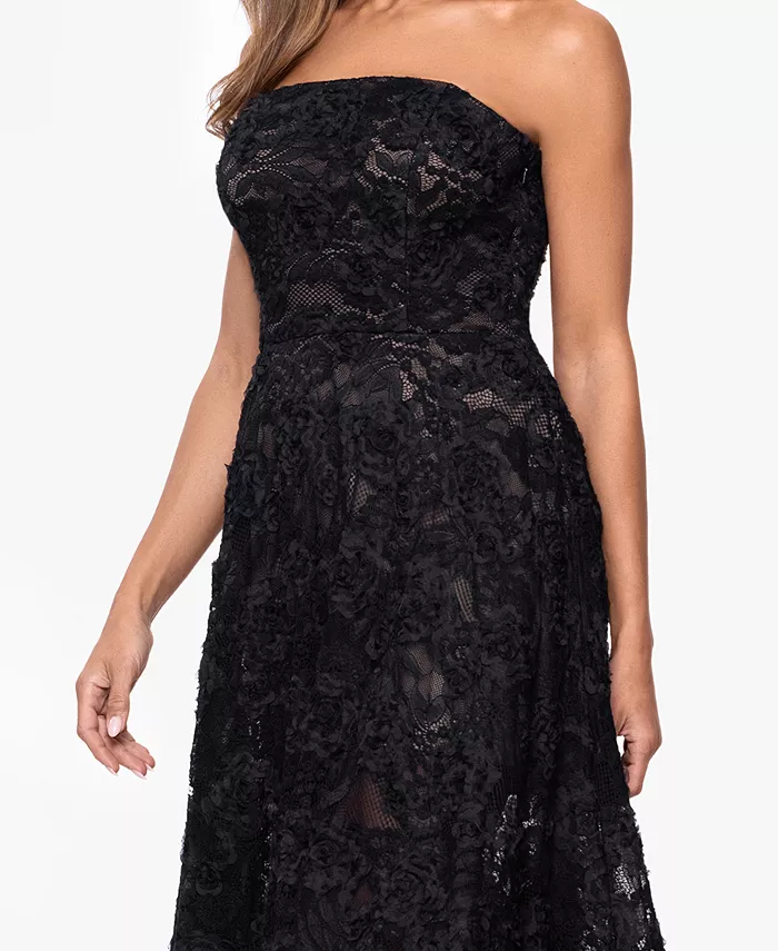 Излучайте классическую красоту в этом платье XSCAPE, украшенном изящным кружевом. Вырез без бретелек красиво обрамляет плечи и ключицы. Длина миди гармонично сочетает элегантность и современность.