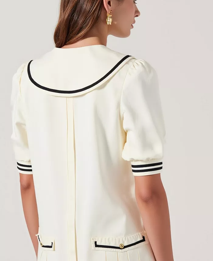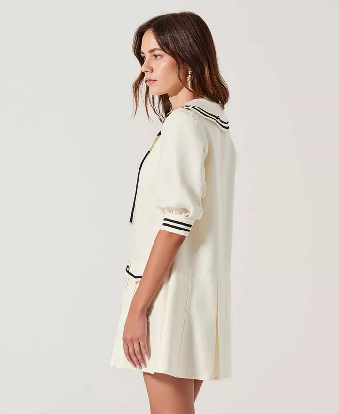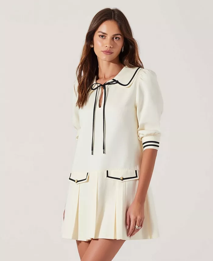 Это мини-платье с длинными рукавами, вдохновлённое винтажной элегантностью в современной интерпретации, отличается структурированным лифом и плиссированной юбкой. Воротник с контрастной отделкой и изящный вырез горловины с бантом создают изысканный образ, а золотистые пуговицы на карманах подчёркивают изысканность модели. Идеально подходит для дневных выходов или создания ансамблей в стиле преппи.