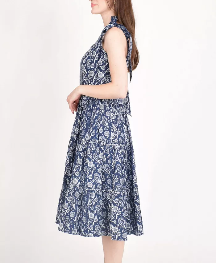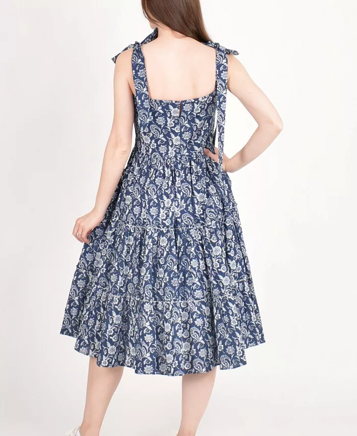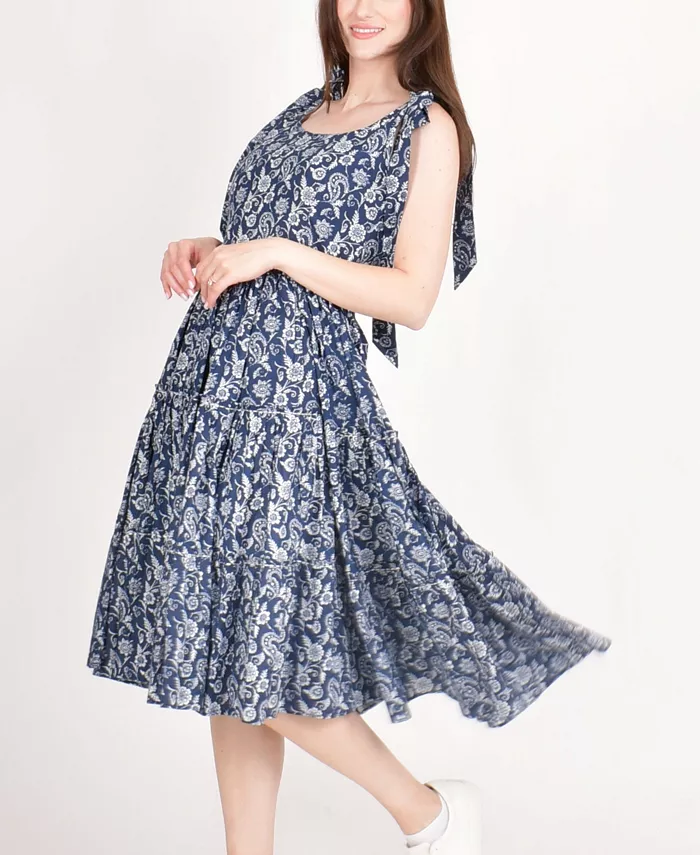 Платье миди Mila Blue Tiered из дышащего хлопка излучает очарование благодаря сплошному цветочному узору и облегающему силуэту с расклешенной юбкой. Многослойная конструкция и игривые бретели-бабочки делают это синее платье миди одновременно комфортным и стильным. Идеально подходит для солнечных прогулок, бранча или любого расслабленного летнего дня.