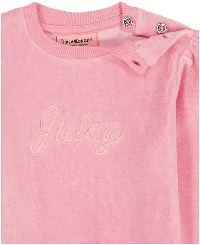 Этот уютный комплект от Juicy сочетает в себе комфорт и стиль: классический топ с круглым вырезом, мягкими длинными рукавами и фирменной вышивкой логотипа на груди придаёт ему элегантный вид. В сочетании с велюровыми брюками-стрингами он легко надевается и согревает в течение всего дня.