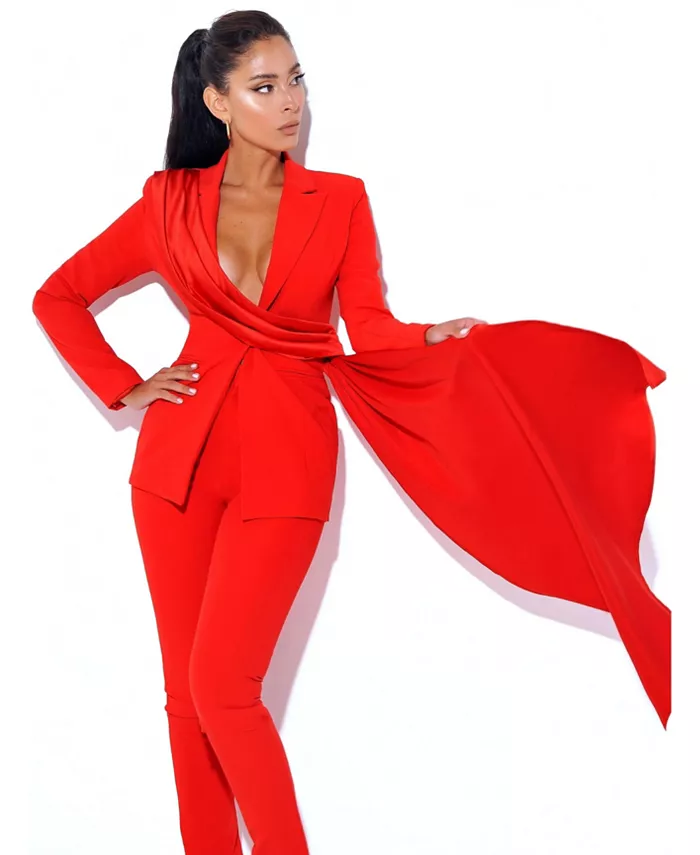 Vandra станет вашим фаворитом в этом сезоне! Этот потрясающий пиджак выполнен из эластичного крепа-стрейча и полностью на подкладке для комфортной посадки. Застёжка на крючок по центру спереди обеспечивает надёжную посадку. Vandra, созданный для того, чтобы выделяться, отличается острыми лацканами, вшитыми подплечниками и облегающим силуэтом, который подчёркивает ваши изгибы. Длинный драпированный пояс обхватывает плечо и ниспадает по талии до пола, добавляя эффектности. Сочетайте его с нашими креповыми брюками Vayla Red Skinny Fit, чтобы создать идеальный комплект из двух предметов. Доступен в классическом красном или захватывающем дух белом цвете.