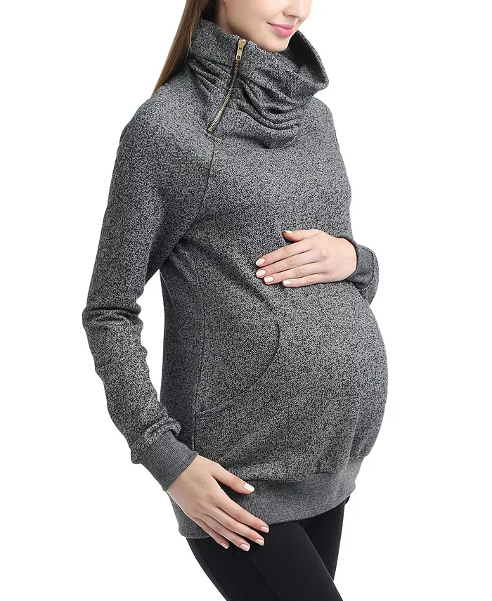 Выглядите стильно и модно в этом удобном сочетании цвета и фактуры. Этот лёгкий многослойный свитер сшит из мягкого меланжевого французского трикотажа из смеси хлопка и полиэстера. Эффектный вид высокого воротника дополняется аккуратными сборками. Функциональная молния позволяет носить воротник различными способами. Модель имеет куполообразную форму, карманы-кенгуру и трикотажные вставки в рубчик. Спроектирован для ношения до полного вынашивания ребёнка, начиная с дородового размера.