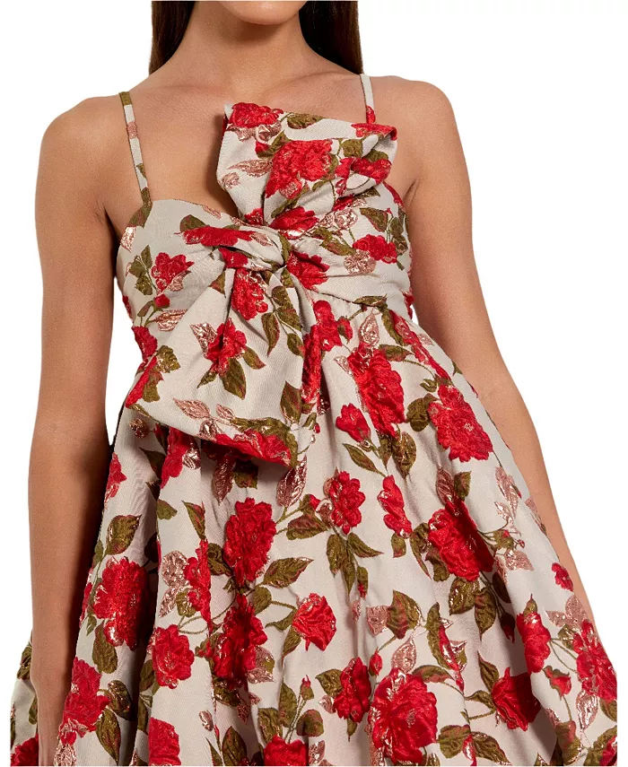 Привлеките внимание в этом романтическом мини-платье с цветочным принтом, большим смелым бантом, объемным подолом-пузырем и роскошными вышитыми розами - оно идеально подойдет для садовых вечеринок, свадеб или торжественных вечеров.
