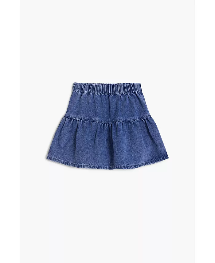 Короткая джинсовая юбка из хлопчатобумажной ткани с горизонтальными вставками, эластичным поясом, эффектом потертости и декоративной вышивкой.