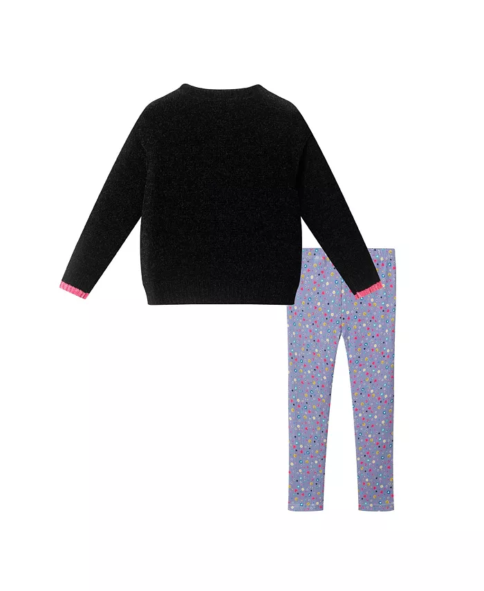Мягкий черный свитер с забавной графикой в стиле нашивок в ярких тонах. Ребристые манжеты с контрастной розовой отделкой добавляют неожиданную изюминку. Леггинсы с принтом украшены цветочным рисунком по всей поверхности и эластичны для свободы движений. Полиэстер/спандекс Можно стирать в стиральной машине Импортный
