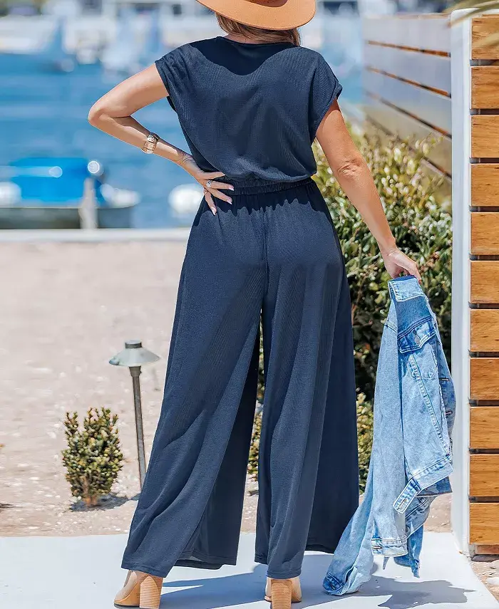 Синий комбинезон In Her Element - идеальный вариант для создания образа на каждый день! Вырез горловины, короткие рукава, завязка на талии и широкие штанины создают лёгкую структуру и создают ощущение мягкости и струящейся ткани.