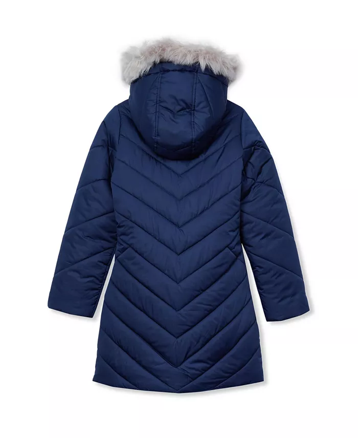Эта парка для девочек со стёганым верхом длиной чуть выше колена обеспечивает максимальную защиту. Мягкая велюровая флисовая подкладка согреет девочку в любое время года. Кроме того, искусственный меховой капюшон такой же милый, как и уютный.
