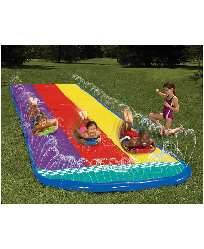 Гонка к финишу! Сделайте эти жаркие дни незабываемыми с оригинальной водной горкой на заднем дворе с тремя дорожками! Длина горки составляет 16 футов, а на бортике - стена воды. Легко устанавливается благодаря системе садовых шлангов «подключи и иди». В комплекте три бонусных буги-каталки.