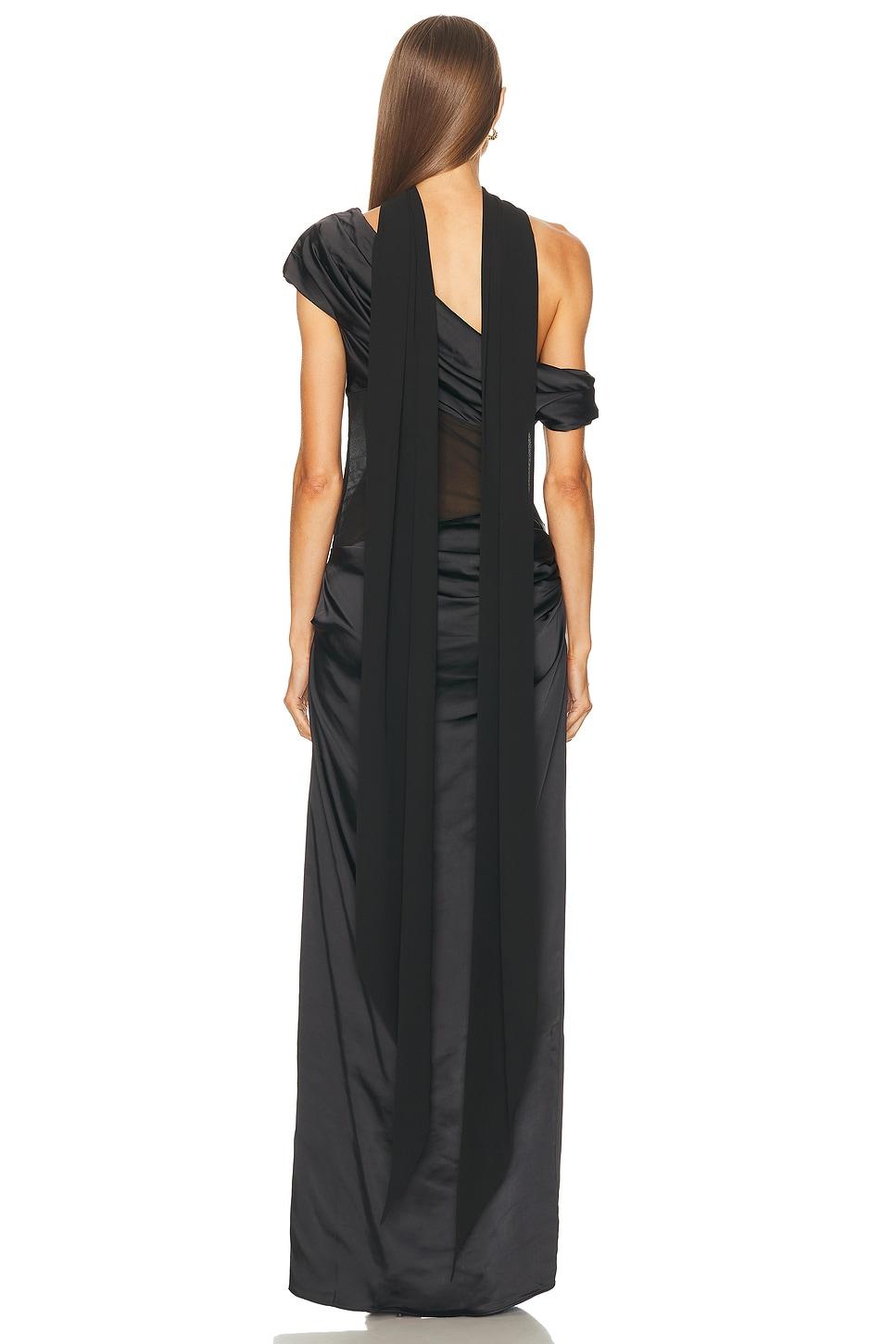 Атласная ткань с прозрачной шифоновой вставкой на лифе.