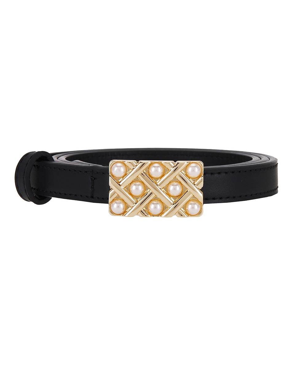 Застежка на пряжку золотистого тона, украшенная искусственным жемчугом.