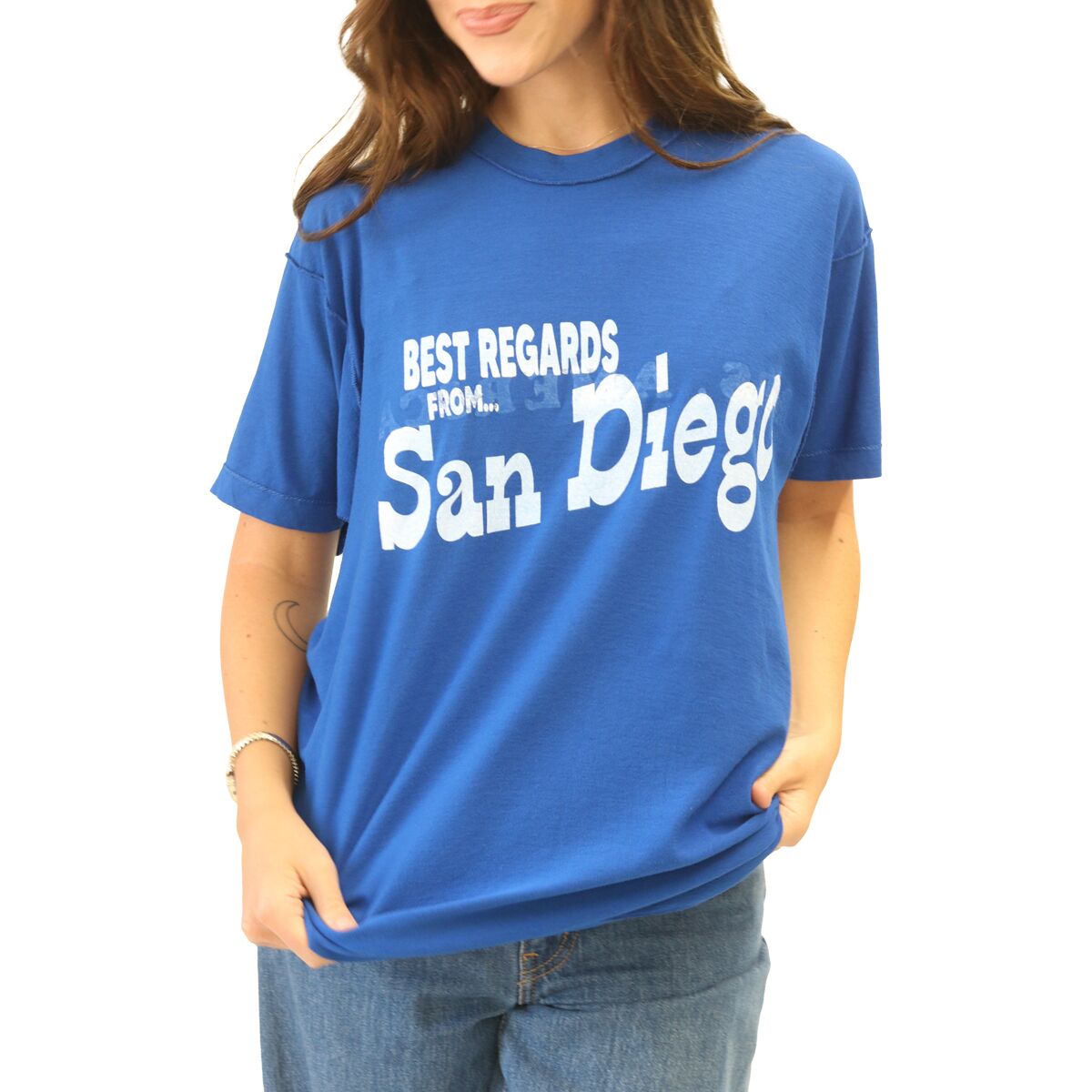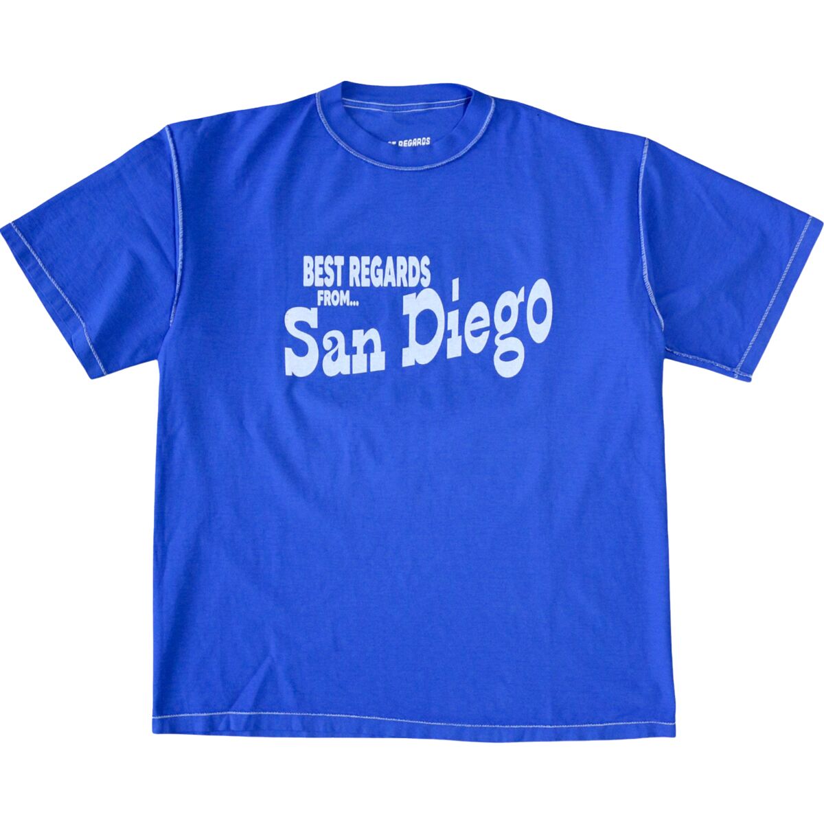 Мы живём в непринуждённой энергии Южной Калифорнии, и футболка с надписью «Best Regards San Diego Postcard» дарит солнечное настроение, куда бы мы ни отправились. Благодаря мягкому 100% хлопку и рисунку в стиле ретро эта футболка - словно сувенир с прекрасного дня на побережье - непринуждённая, стильная и готовая ко всему.