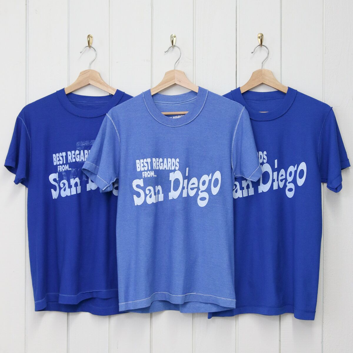 «Эта футболка - незаменимая вещь в моей коллекции для тёплой погоды. 100% хлопок делает её невероятно дышащей, а рисунок с изображением открытки Сан-Диего придаёт ей непринуждённый, ретро-образ. Идеально подходит для дней, которые начинаются с завтрака и заканчиваются на пляже».
