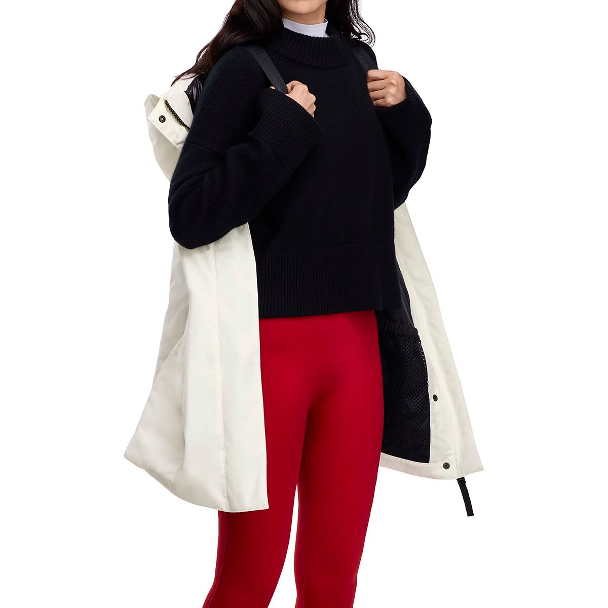 «Leslie Parka BD - это то, что я ношу, когда город становится холодным. Она элегантная, но тёплая, и мне нравится, что А-образный крой не создаёт ощущения громоздкости. Ткань Arctic Tech сохраняет сухость и защищает от ветра, а лямки рюкзака позволяют легко носить её внутри, не перегреваясь».
