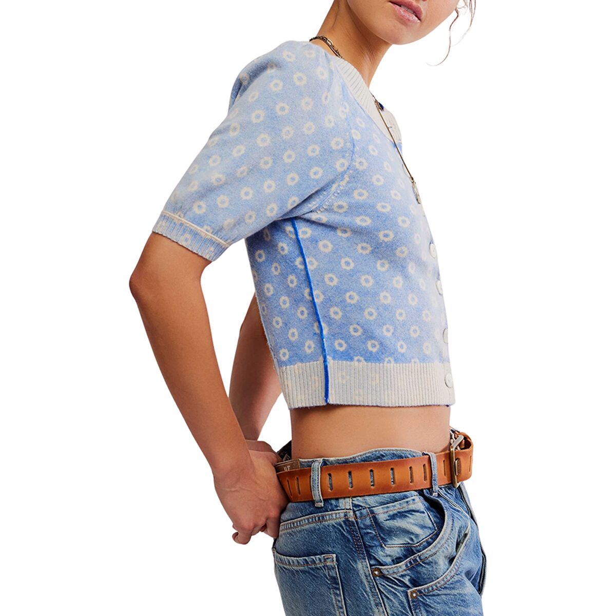 Короткие рукава-буфы и круглый вырез горловины придают винтажный вид, а контрастные пуговицы добавляют игривости. Независимо от того, застегнут ли он как самостоятельный топ или надет поверх майки и футболки, этот кардиган добавит тепла и очарования любому образу.