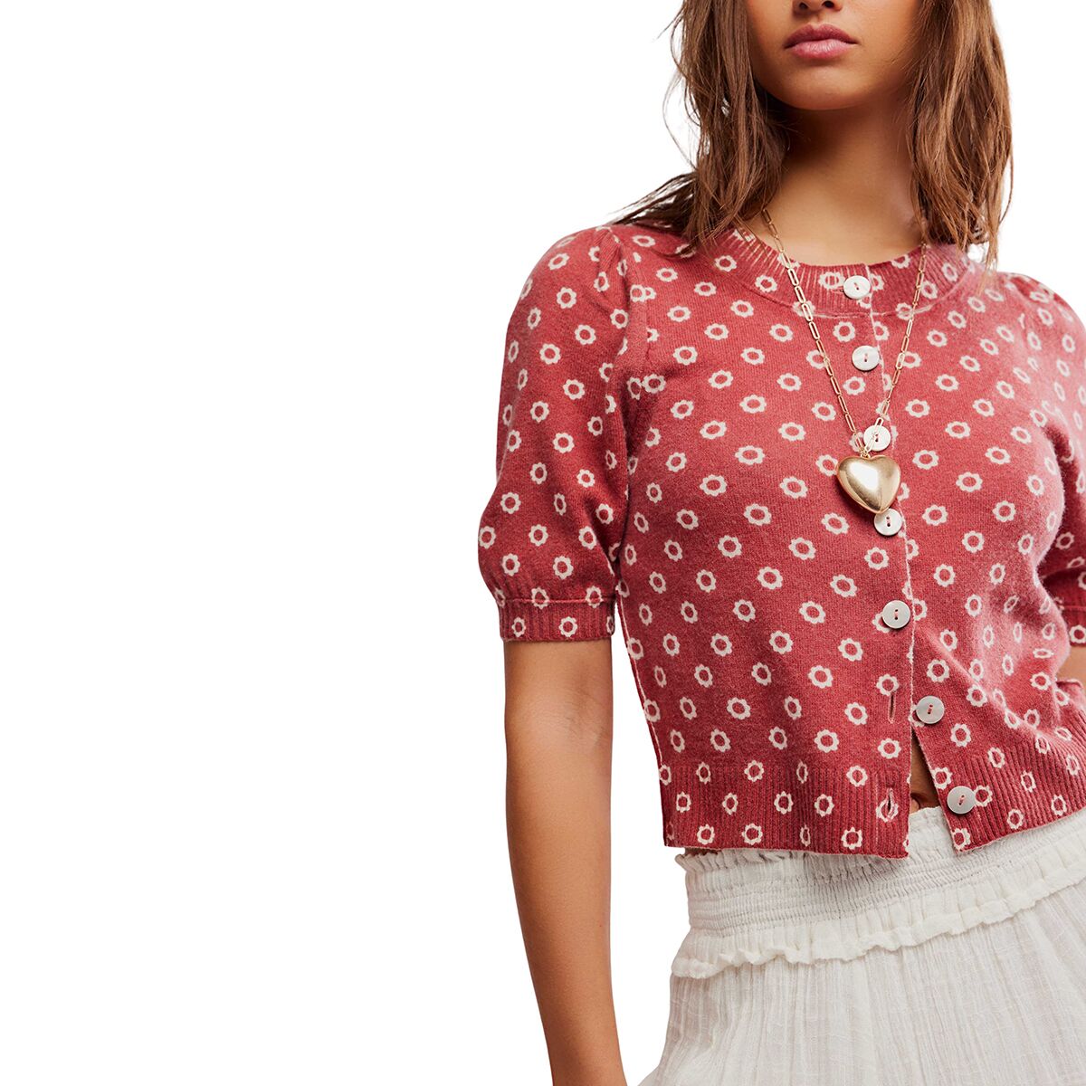 Короткие рукава-буфы и круглый вырез горловины придают винтажный вид, а контрастные пуговицы добавляют игривости. Независимо от того, застегнут ли он как самостоятельный топ или надет поверх майки и футболки, этот кардиган добавит тепла и очарования любому образу.