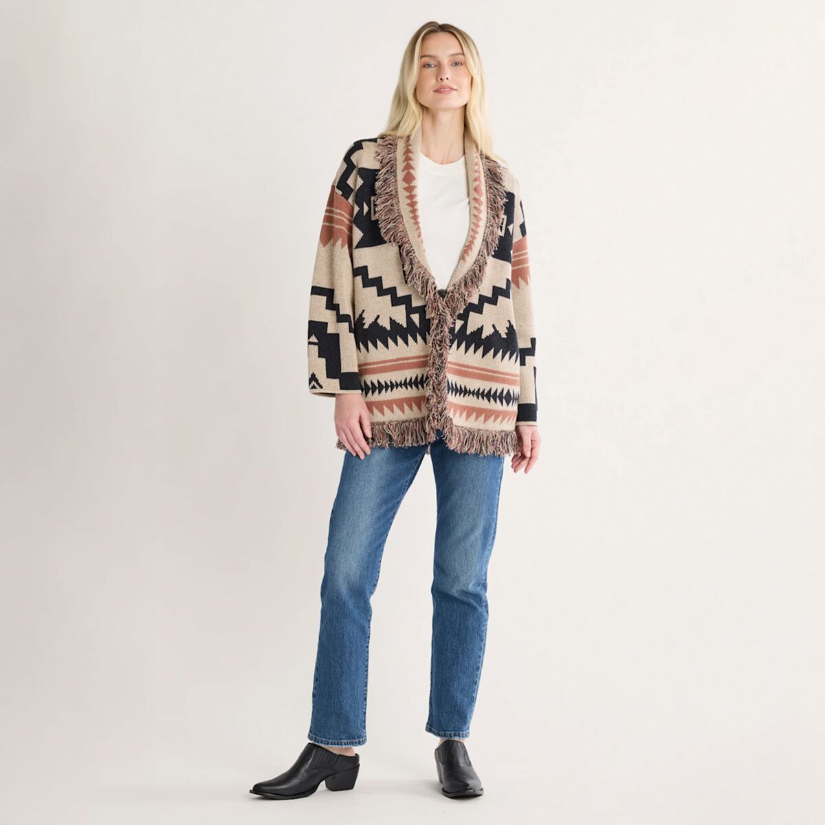 Эффектный кардиган с ярким графическим рисунком и бахромой