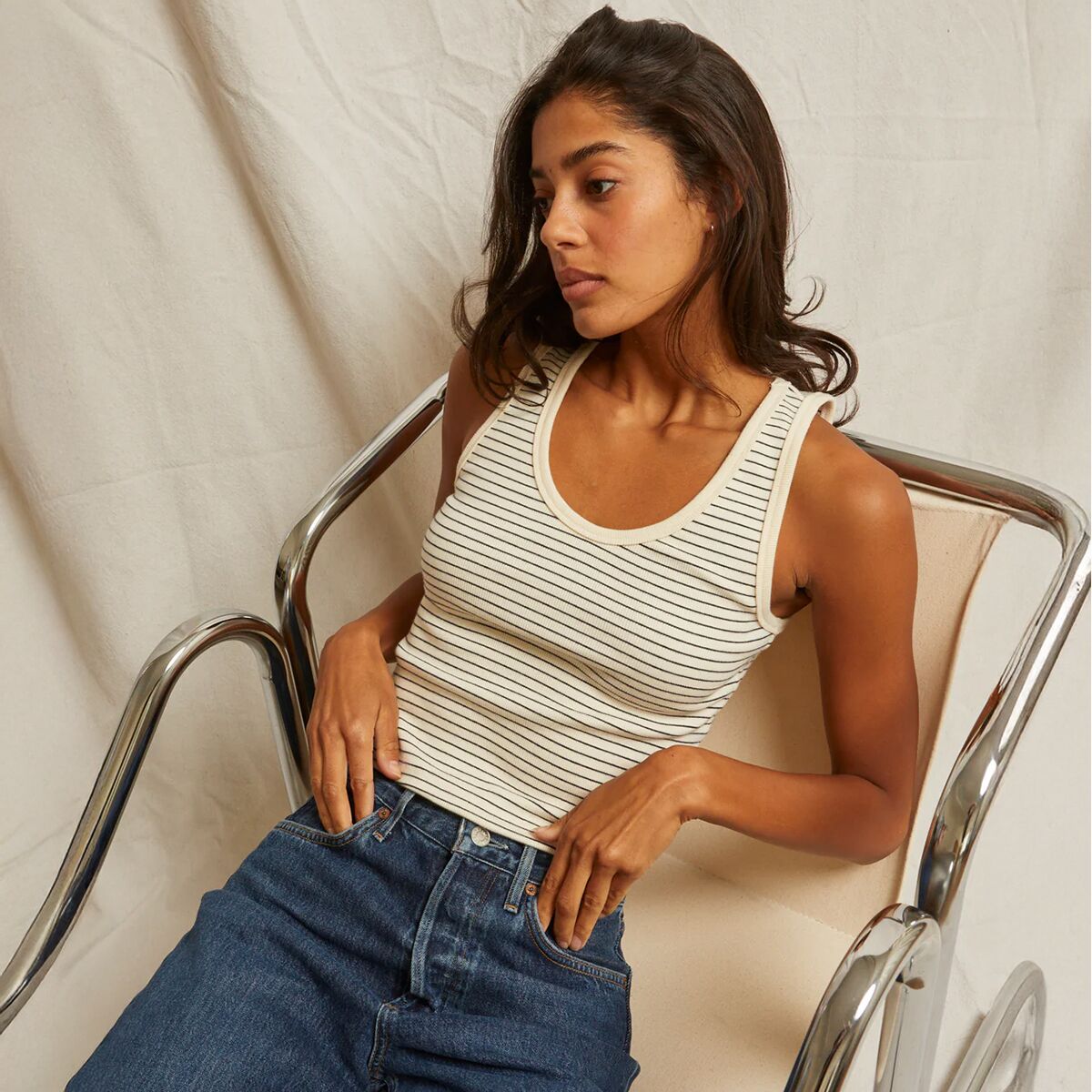 Когда комфорт встречается со стилем, мы выбираем майку Blondie Stripe Structured Rib Bra Friendly. Благодаря роскошной ткани в рубчик из хлопка и спандекса эта майка ощущается как вторая кожа - мягкая, прочная и достаточно облегающая, чтобы подчеркнуть фигуру. Она сшита так, чтобы сохранять форму после многократной носки, поэтому мы можем положиться на неё как на повседневные повседневные образы, так и на прохладные вечера.
