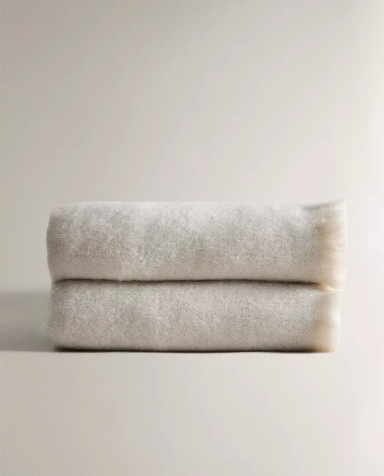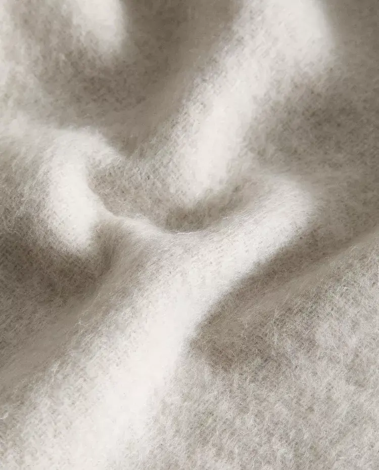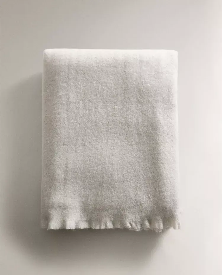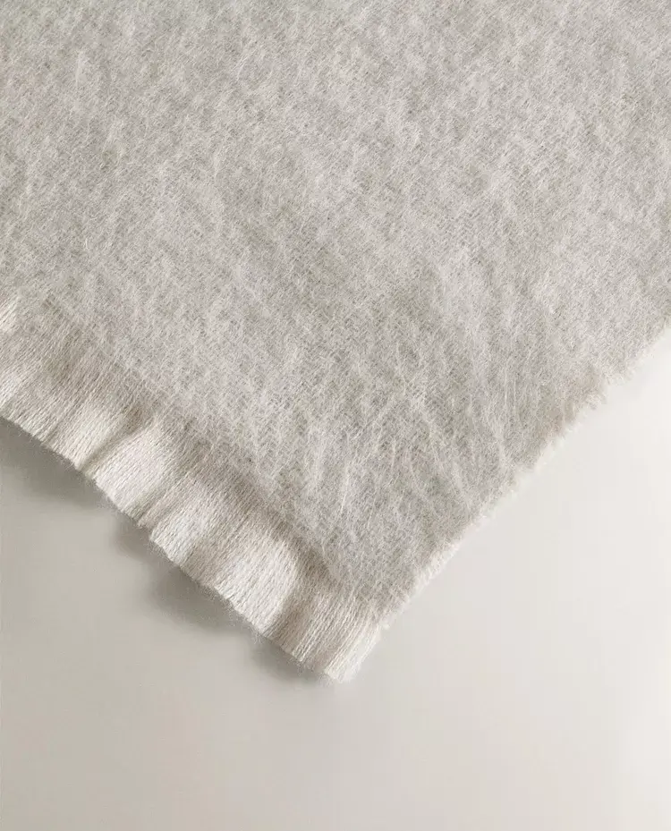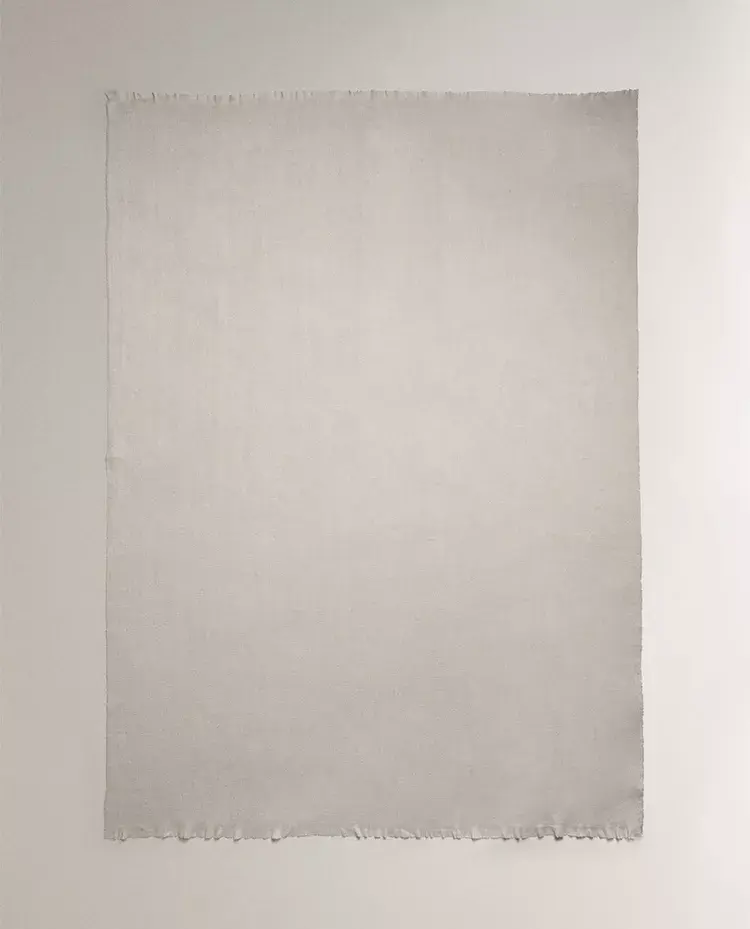 Теплое и легкое на ощупь одеяло из однотонной ткани с едва заметной бахромой по краю.
