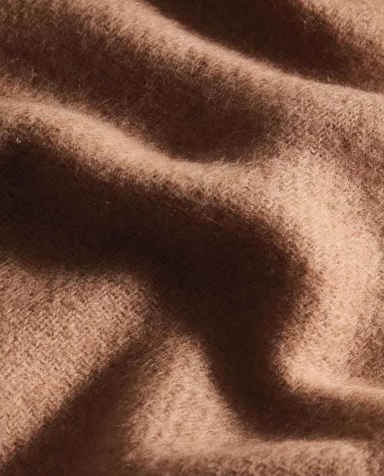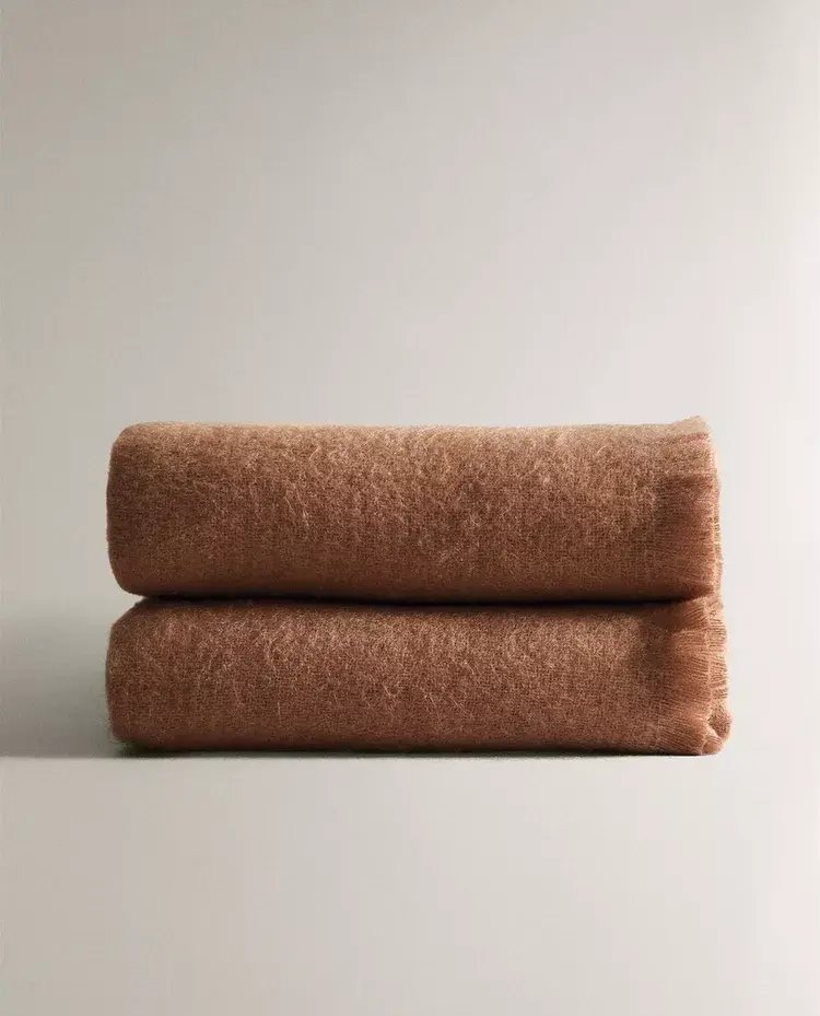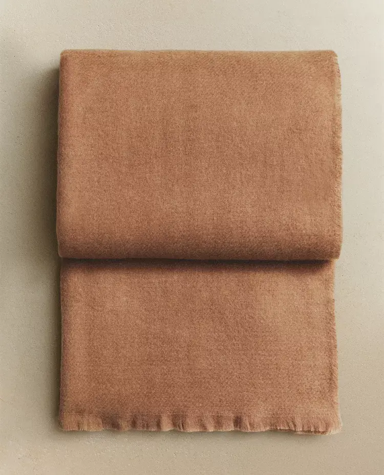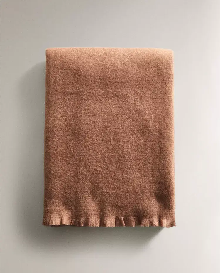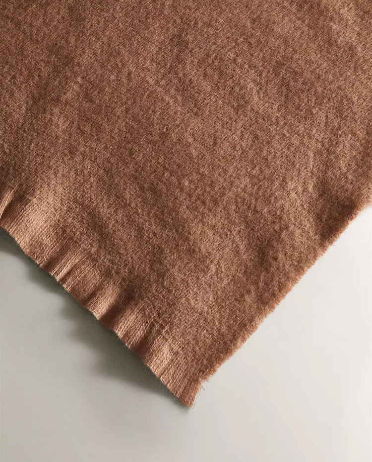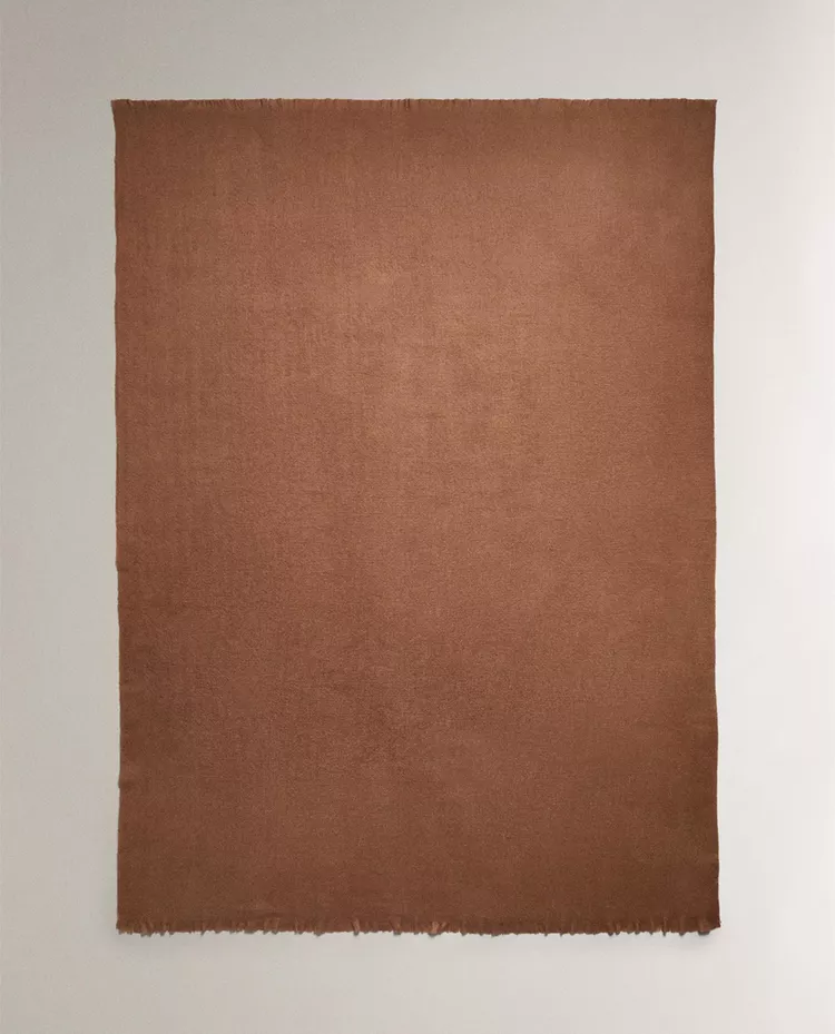 Теплое и легкое на ощупь одеяло из однотонной ткани с едва заметной бахромой по краю.