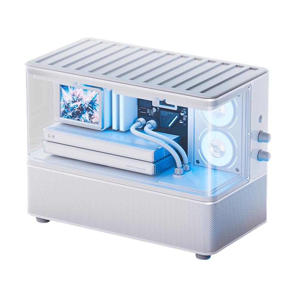 Панорамная структура с прозрачным стеклом с трех сторон спроектирована с разделением верхней и нижней перегородки. Внизу расположена акустическая зона с 4-дюймовым низкочастотным динамиком, двойным 52-миллиметровым среднечастотным динамиком и пассивным излучателем, а наверху — прозрачная декоративная зона со встроенными вентиляторами, подсветкой, 2,8-дюймовыми цветными экранами и открытыми функциональными модулями.