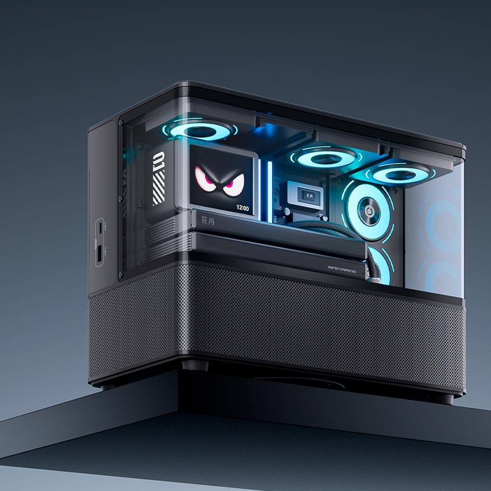 Панорамная структура с прозрачным стеклом с трех сторон спроектирована с разделением верхней и нижней перегородки. Внизу расположена акустическая зона с 4-дюймовым низкочастотным динамиком, двойным 52-миллиметровым среднечастотным динамиком и пассивным излучателем, а наверху — прозрачная декоративная зона со встроенными вентиляторами, подсветкой, 2,8-дюймовыми цветными экранами и открытыми функциональными модулями.
