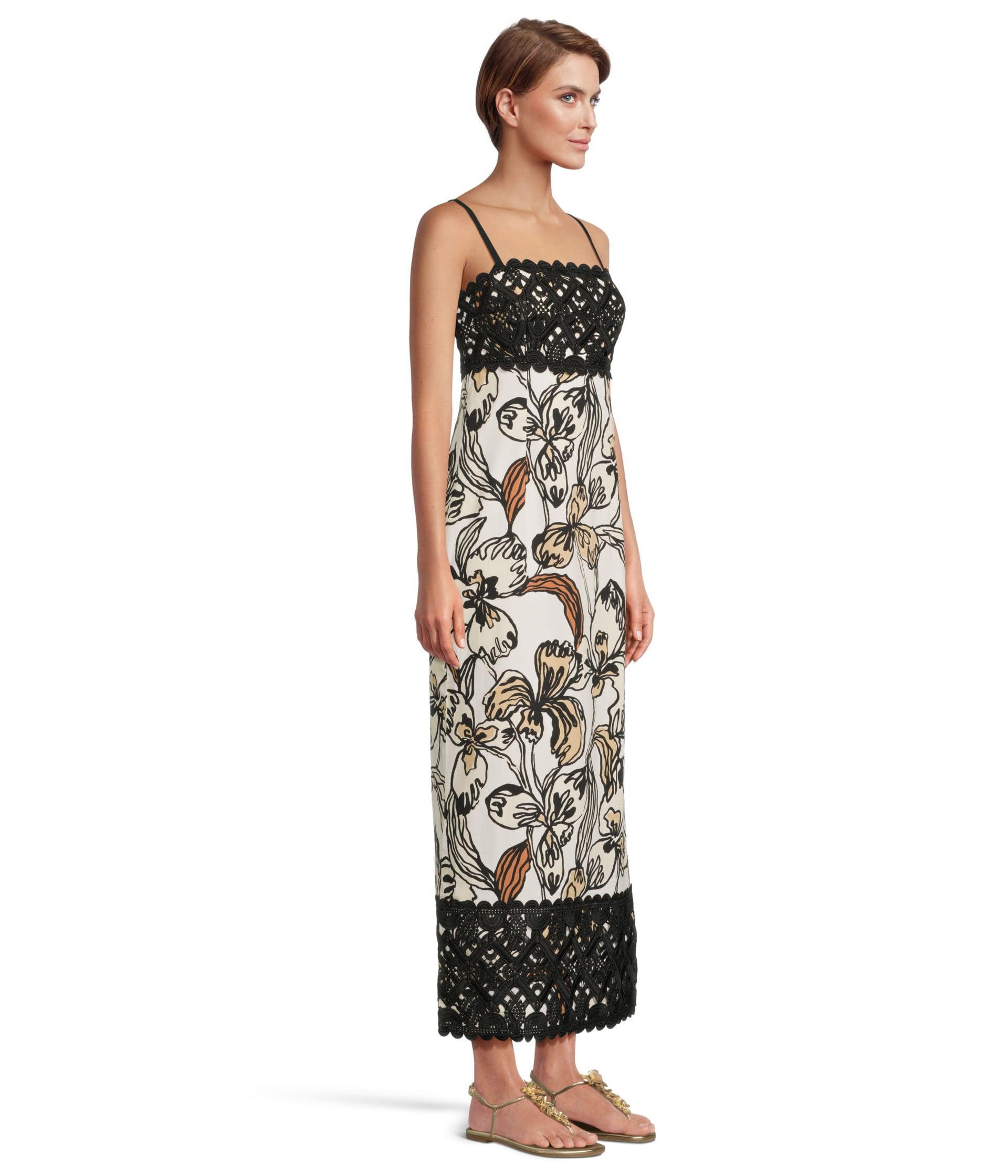 • Платье макси Lilly Pulitzer Vena Stretch – облегающее платье длиной до щиколотки с регулируемыми тонкими бретельками, чашечками на лифе, боковыми разрезами и широкой кружевной отделкой Lilly. Платье макси украшено цветочным принтом по всей поверхности, имеет квадратный вырез и прямой подол.