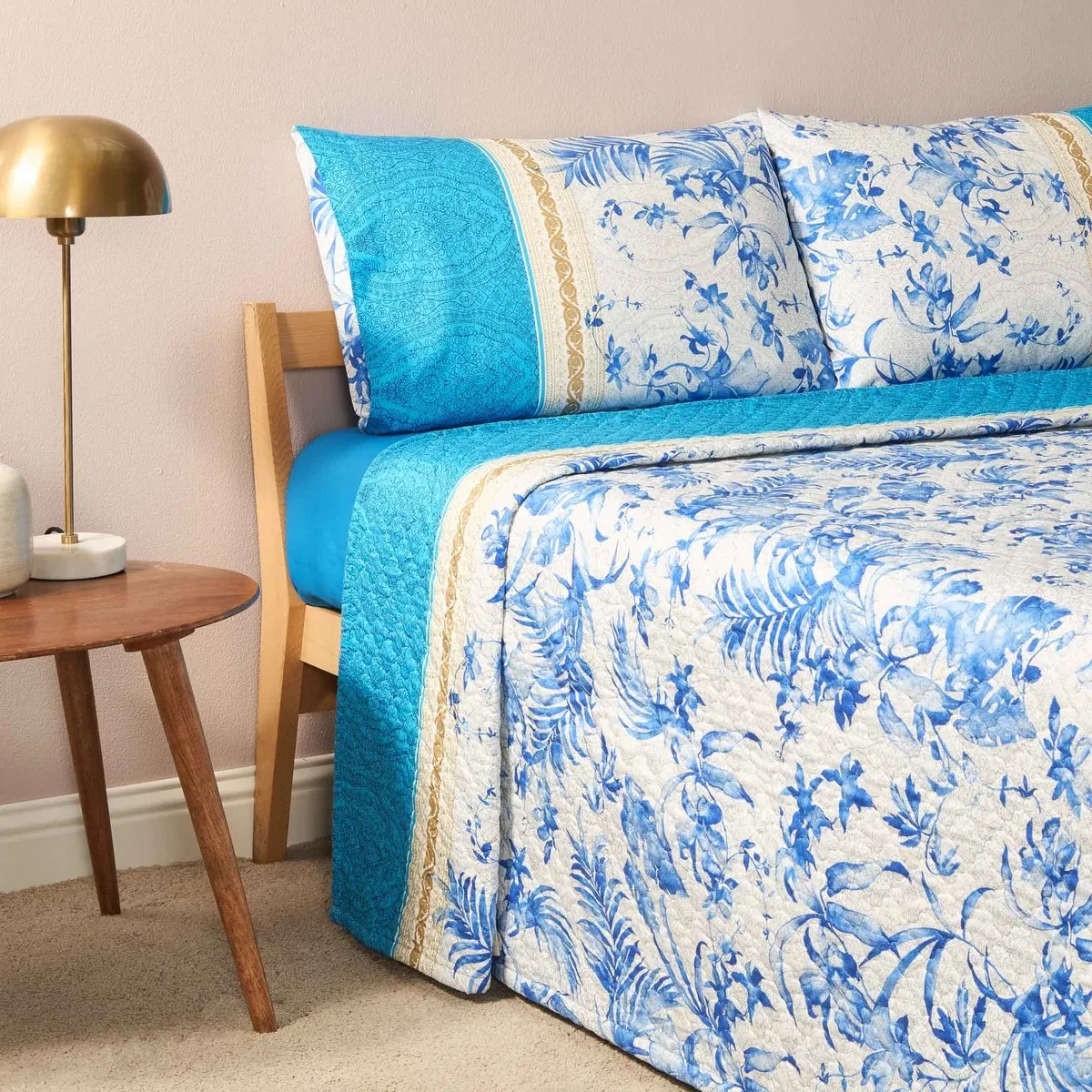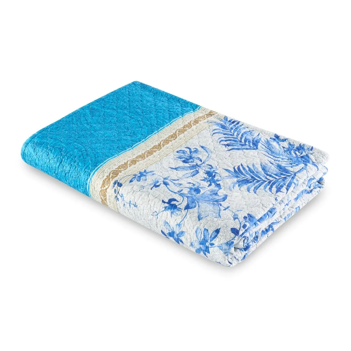 Покрывало с цветочным и листовым узором в синих тонах.