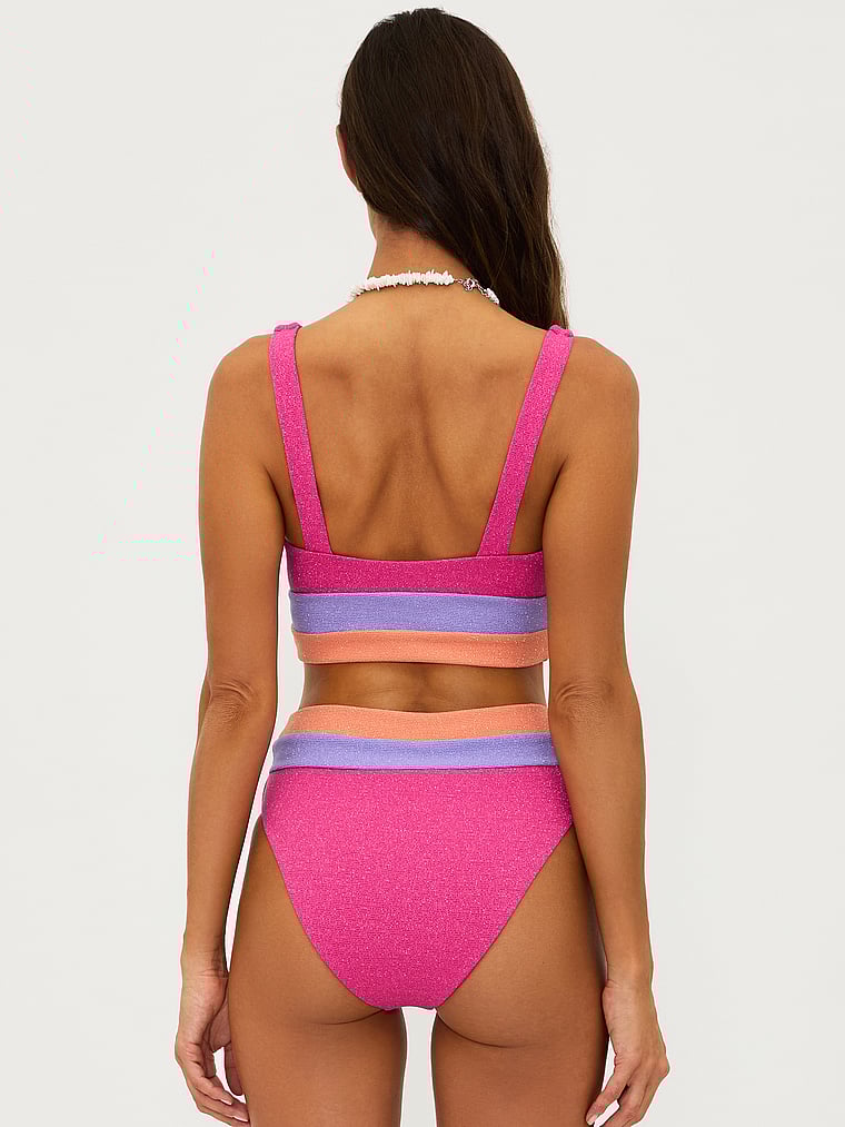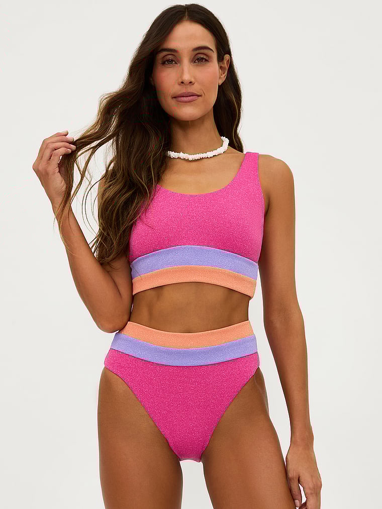 Яркие цветовые блоки добавляют интереса этой спортивной удлиненной модели из мерцающей ткани с люрексом. Сочетайте ее с плавками Heidi Bottom для создания классического, гармоничного образа.