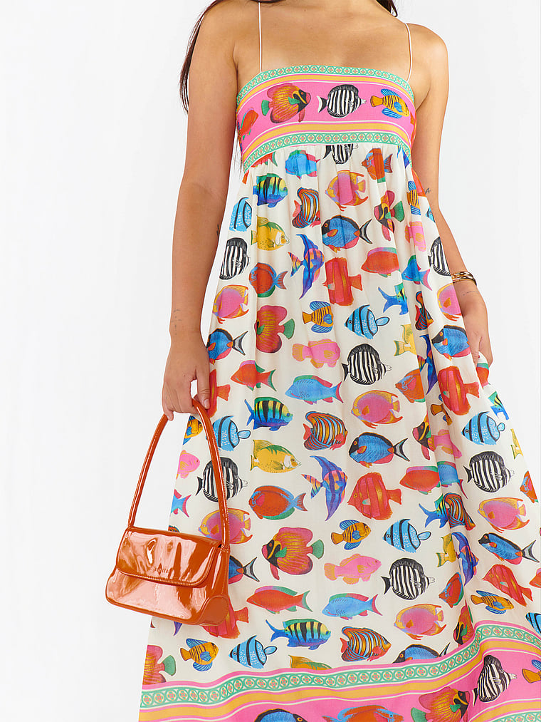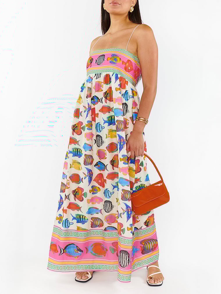 Красочный узор украшает это яркое и воздушное макси-платье с тонкими бретельками, присборенной спинкой и струящимся силуэтом для вашего комфорта.