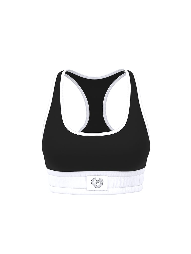 Поддерживающая эластичная нижняя часть с розовым логотипом и присборенными деталями.