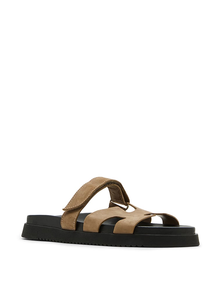 Кожаные шлепанцы MAYVEN отличаются удобными деталями конструкции, такими как формованная стелька, рифленая плоская подошва и регулируемый верхний ремешок, а также передний ремешок с геометрическим вырезом.