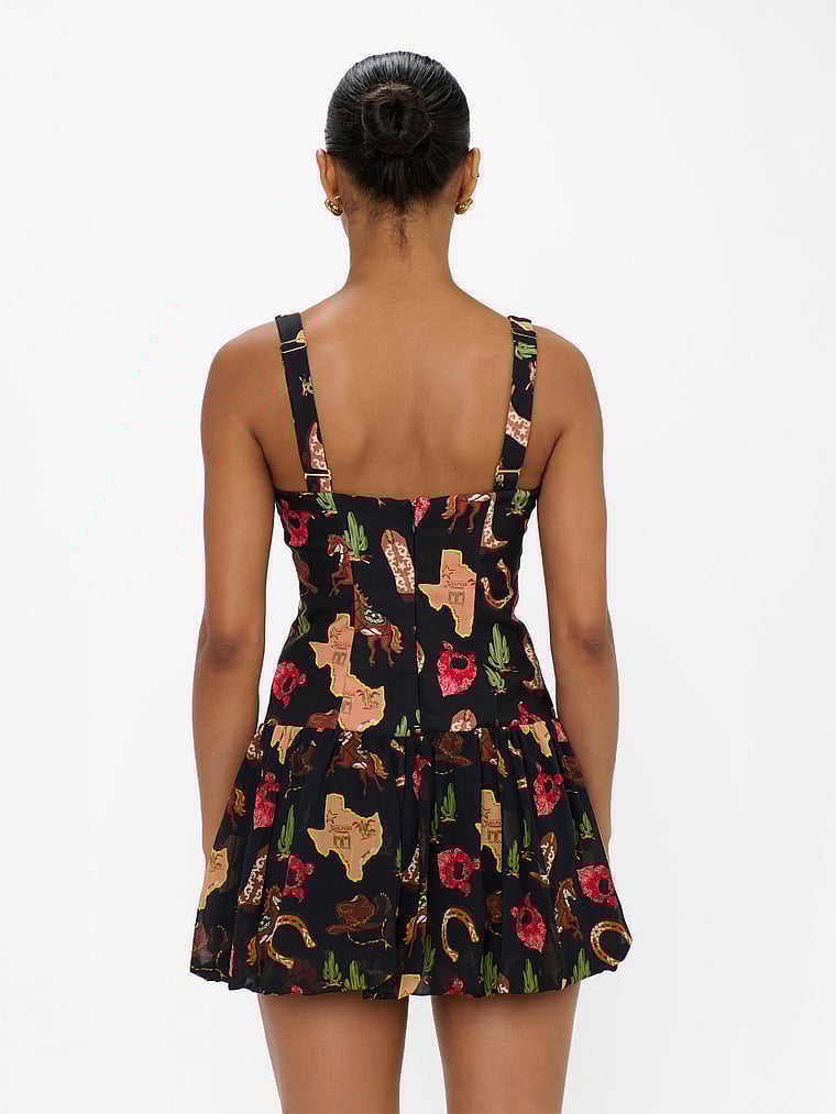 Маленькое черное платье для девушек-ковбоев. Облегающий лиф подчеркивает изгибы, а игривая юбка-фонарик добавляет кокетливости и смелости. Платье украшено узором в стиле вестерн и дополните любимыми ботильонами для создания очаровательного вечернего образа.