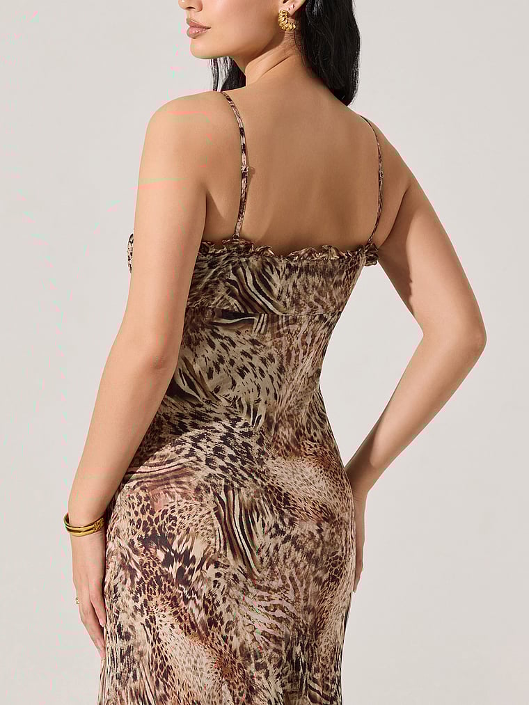 Смелая романтика. Вырез сердечком с контрастным анималистичным принтом и отделкой воланом придает этому платью-комбинации кокетливый вид.