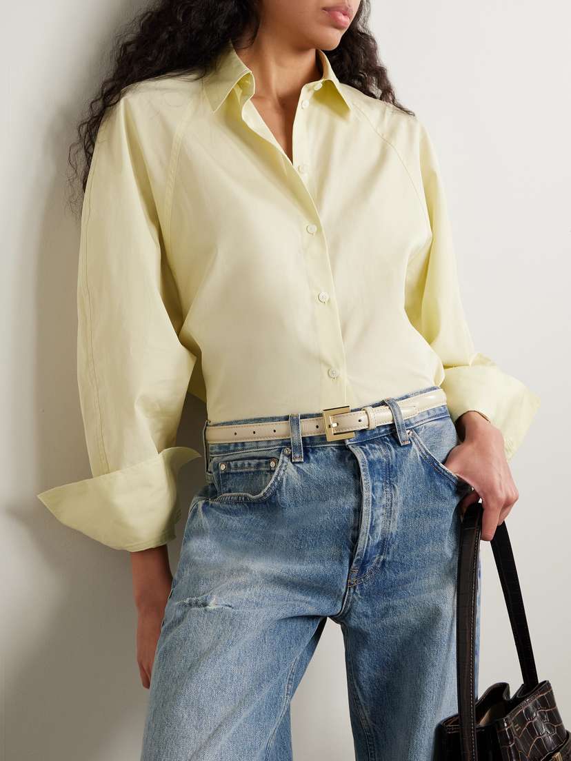 Ремень «Nicola» от Анин Бинг отличается массивной квадратной пряжкой, отлитой из золотистого металла. Ремень изготовлен из мягкой кожи, имеет легкую подкладку для лучшей устойчивости и тонкий профиль, который легко продевается в шлевки большинства брюк.