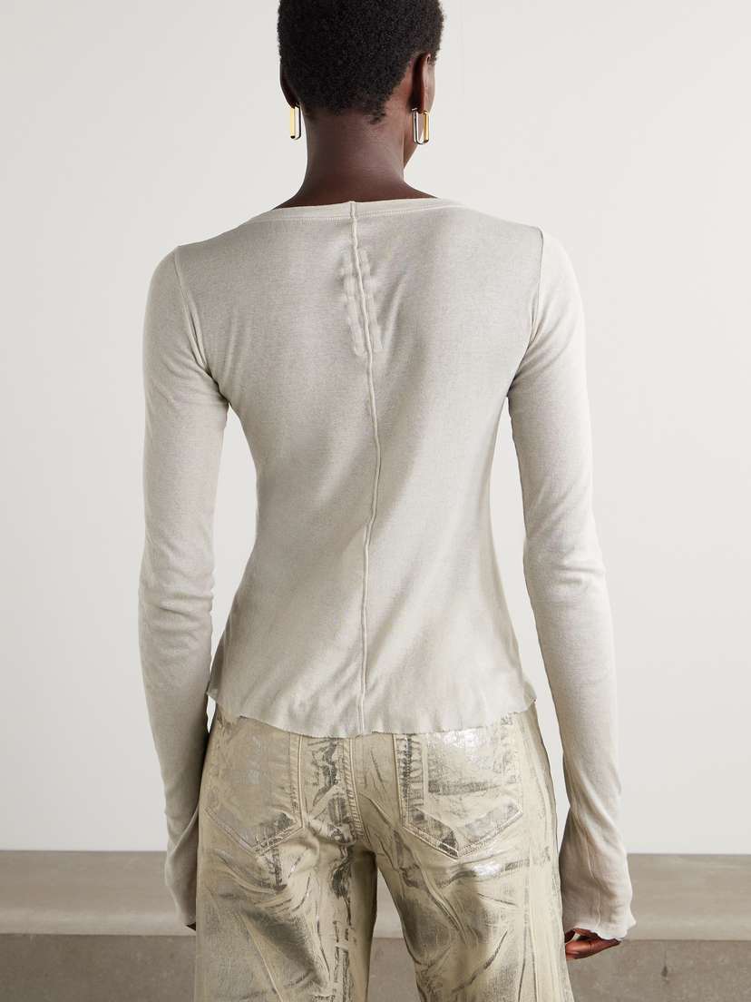 Даже классические модели Рика Оуэнса пронизаны легкой провокационной ноткой: эта футболка с полупрозрачной отделкой и очень длинными рукавами. Она сшита из хлопкового джерси и имеет облегающий крой.