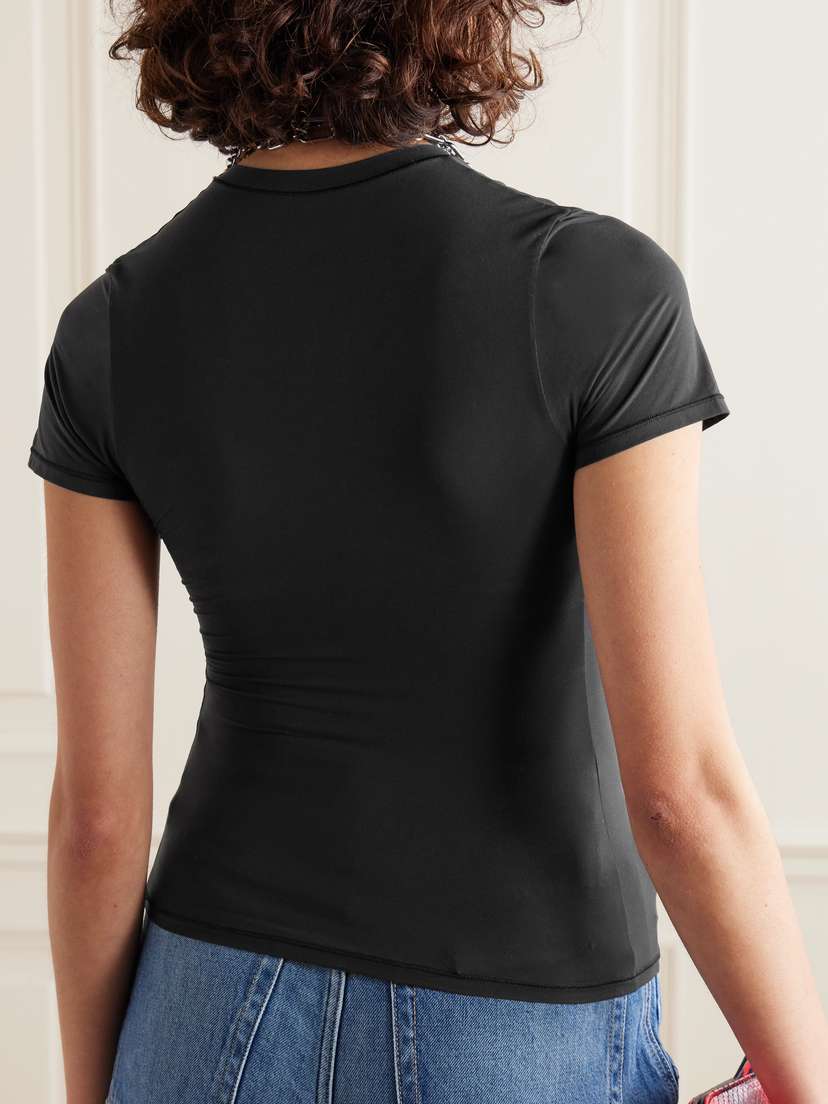 Одна из целей SKIMS - предлагать решения для любой фигуры. Эта облегающая футболка сшита из эластичной ткани и имеет классический круглый вырез. Эту черную версию можно сочетать с чем угодно, от спортивных брюк до классической одежды.